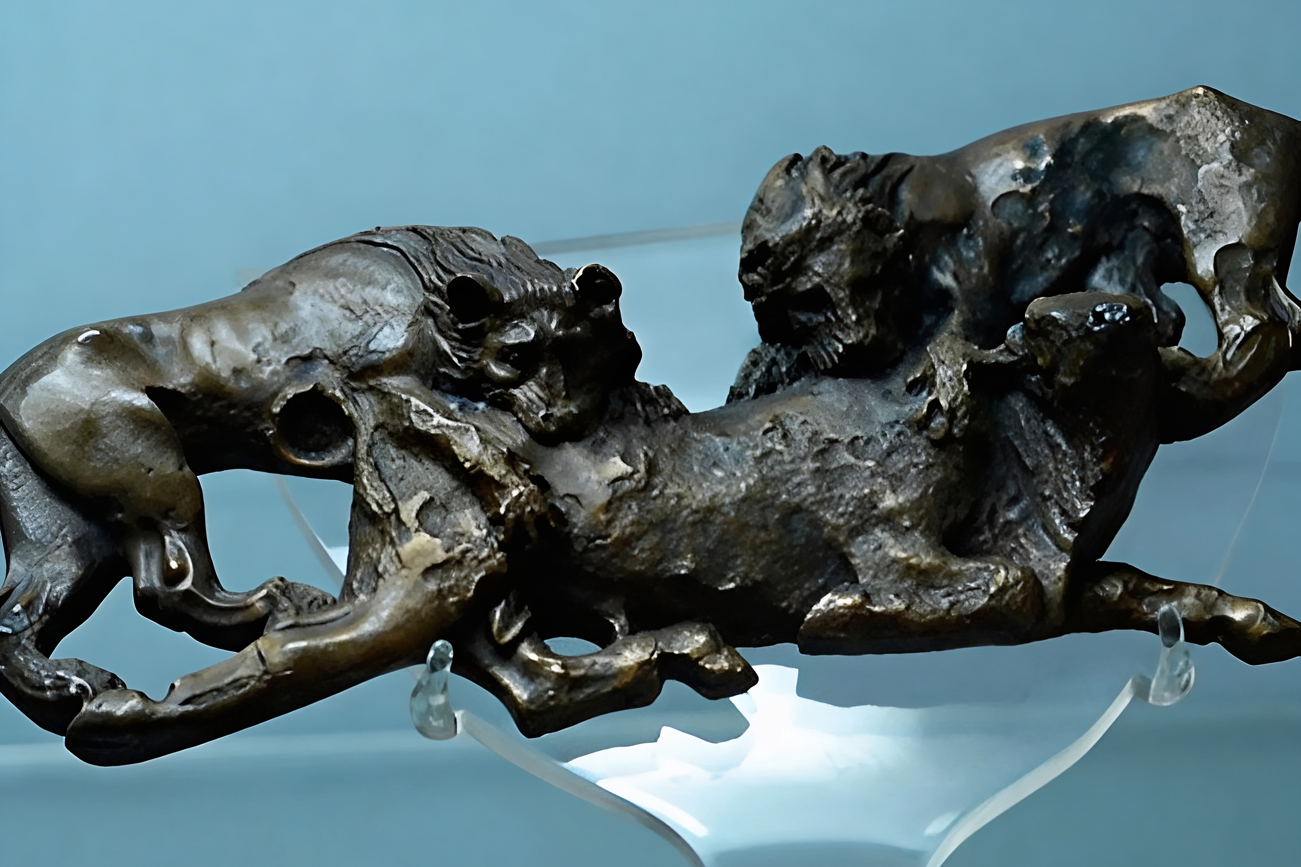 Another powerful visual motif associated with Vouni is the lion-and-bull combat scene, a theme well known from Achaemenid imperial art, particularly at Persepolis. At Vouni, this imagery appeared in bronze reliefs discovered within the Temple of Athena, the highest and most symbolically charged space within the palace complex.