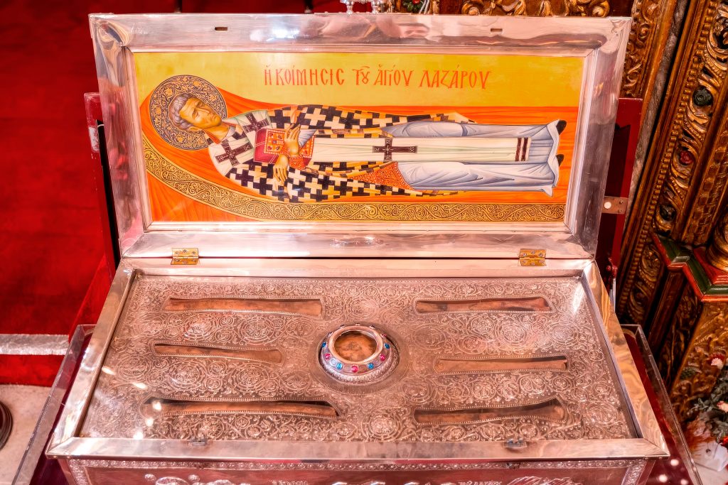The bones now rest in a gold-plated casket within the church, where pilgrims can pay their respects. According to tradition, the Virgin Mary herself visited Lazarus while he lived in Cyprus and presented him with the bishop’s omophorion and epimanikia that she had woven. Another tradition states that during his thirty years after resurrection, Lazarus never smiled except once, when he saw someone stealing a clay pot and remarked that the clay steals the clay.