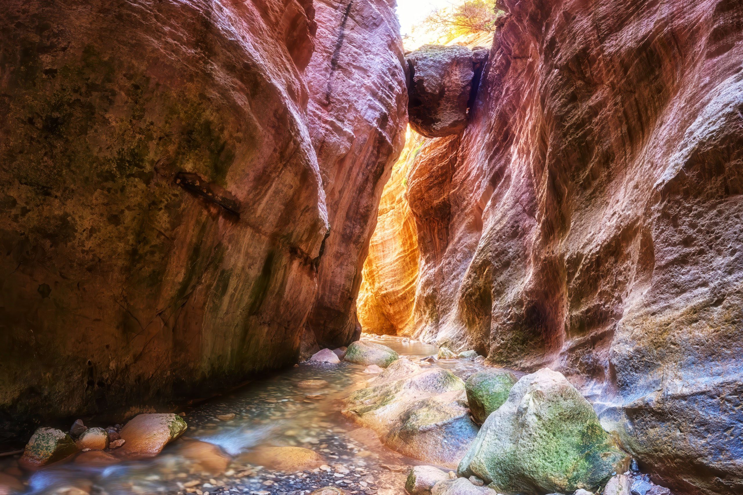 Light filters down between the towering walls, creating dramatic shadows and highlighting the layered rock formations. Wild fig trees and other plants grow from cracks in the stone. The gorge extends for about 3 kilometers. The hike requires good footwear as the path involves scrambling over rocks and sometimes wading through shallow water.