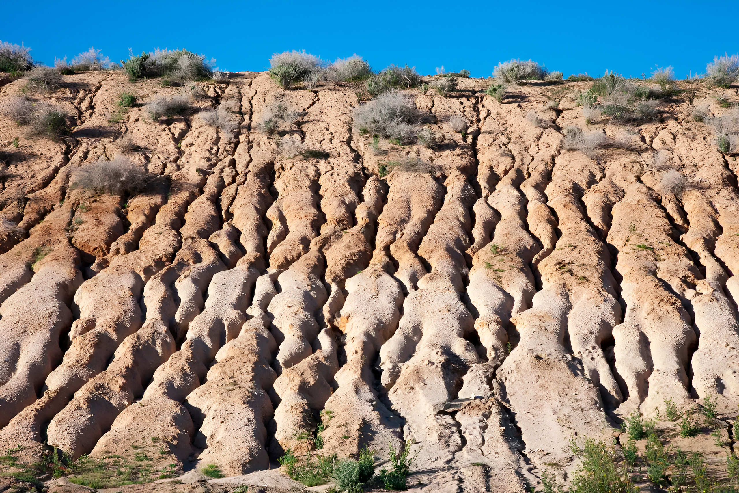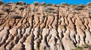 Almyras is a classic badlands landscape. These forms are found in areas where soft, clay-rich rocks are exposed to seasonal rain and long dry periods. Water cannot soak easily into the clay, so rainfall rushes over the surface, carving narrow channels that grow deeper each year.