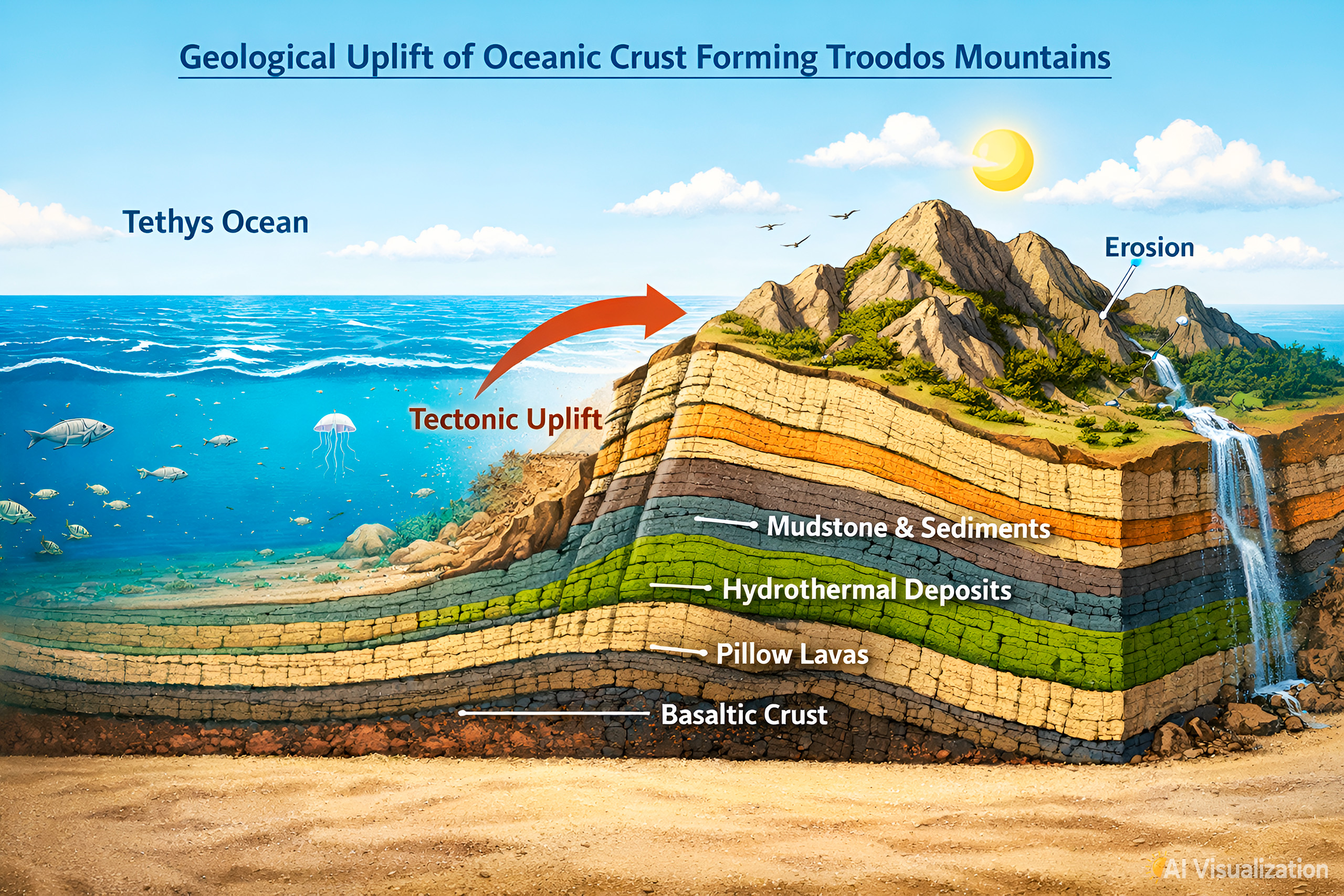 The Troodos Mountains occupy the central part of Cyprus, covering approximately 1,147 square kilometers or about 15 percent of the island. UNESCO designated Troodos as a Global Geopark in 2015 due to its exceptional geological significance. The mountain range represents an ophiolite, which is an uplifted fragment of oceanic crust and upper mantle that formed 92 million years ago during the Upper Cretaceous period. bigstockphoto.com The highest peak, Mount Olympus, reaches 1,952 meters above sea level. What makes Troodos extraordinary is that the deepest rocks now sit at the highest elevations due to a dome structure created by tectonic forces. Visitors walking through Troodos can literally travel from the Earth's upper mantle to the ancient seafloor within a single day. The area contains 38 geosites that display this geological marvel, making it one of the most complete and best preserved ophiolite sequences in the world. Scientists consider Troodos the gold standard for understanding how oceanic crust forms and evolves. commons.wikimedia-org How ocean crust ended up on land The Troodos ophiolite formed in the Neotethys Ocean by seafloor spreading above a subduction zone approximately 92 to 82 million years ago. At that time, the African and Arabian tectonic plates were converging with the Eurasian plate. New oceanic crust formed as magma rose from the mantle and solidified at the spreading center.…