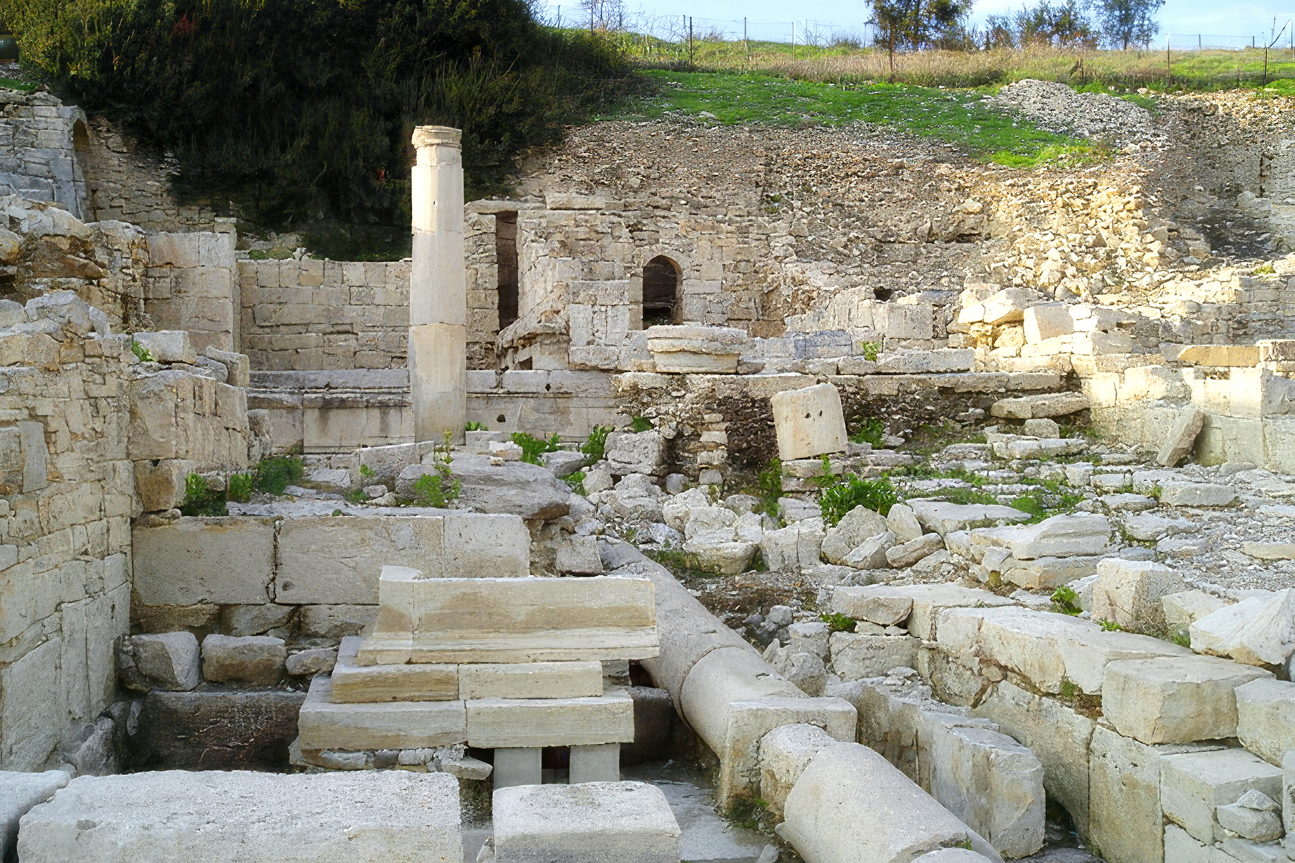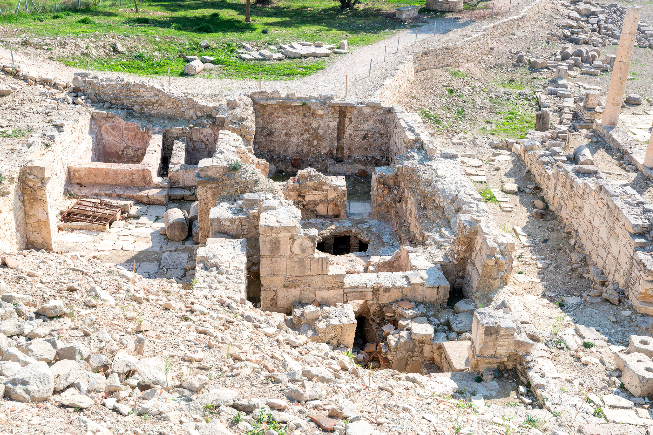The Roman bath complex at Amathus sits adjacent to what was once the central agora or marketplace. Constructed in the 2nd century CE during a period of public improvements commissioned by Emperor Hadrian, the baths demonstrate typical Roman bath design adapted to the Cyprus climate. The structure forms a square layout with cold rooms positioned on the east side and hot and warm rooms on the west, all heated by an underfloor hypocaust system.