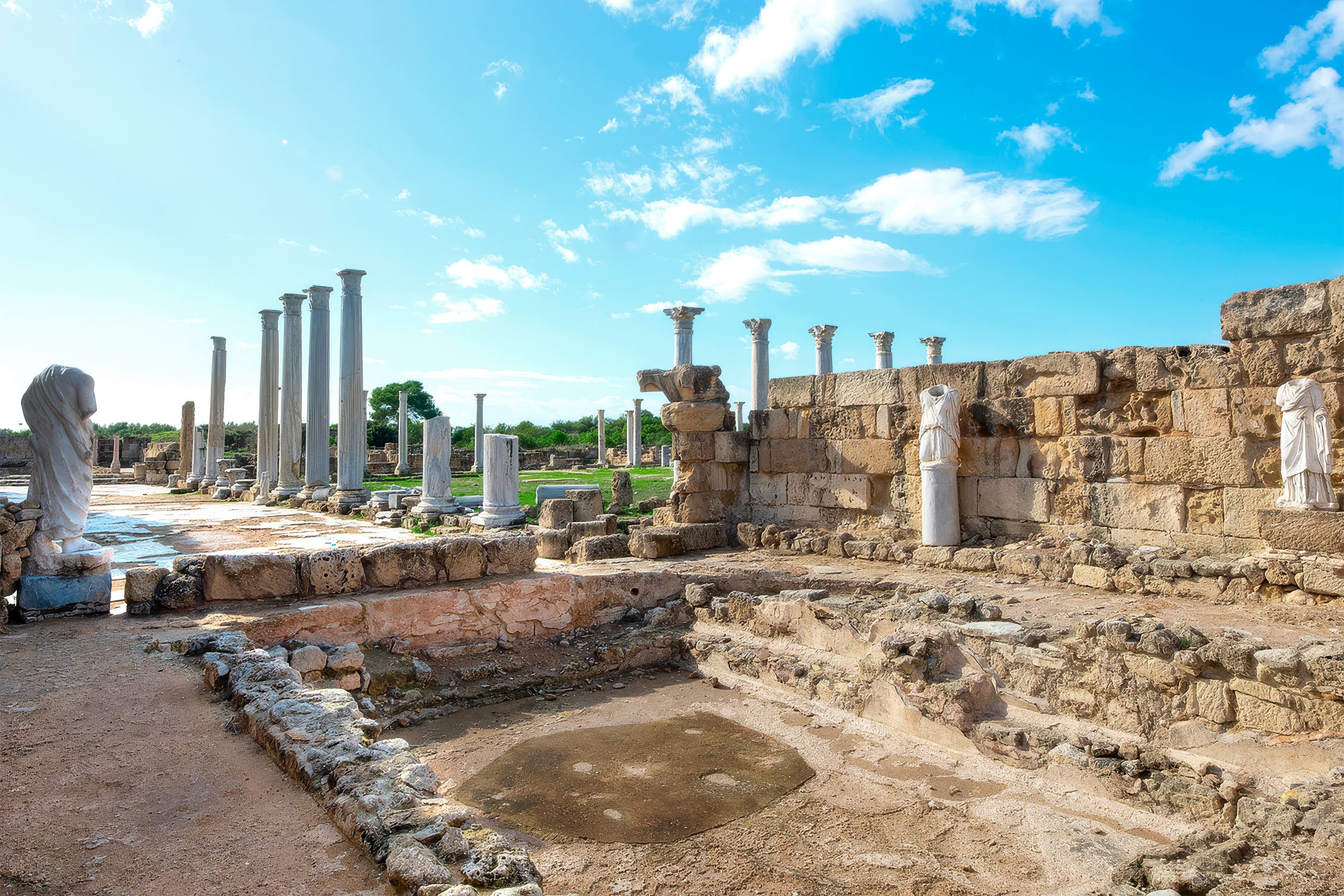 The main reservoir, known locally as the Loutron, stands as one of the most impressive surviving structures from ancient Salamis. This massive water tank measured 52.5 meters long, 15.3 meters wide, and about 5 meters deep, giving it a capacity of roughly 4,000 cubic meters. The rectangular basin was partly below ground level and partly above, with a vaulted roof originally supported by 36 square pillars. Today, visitors can still see the walls and pillar remains.