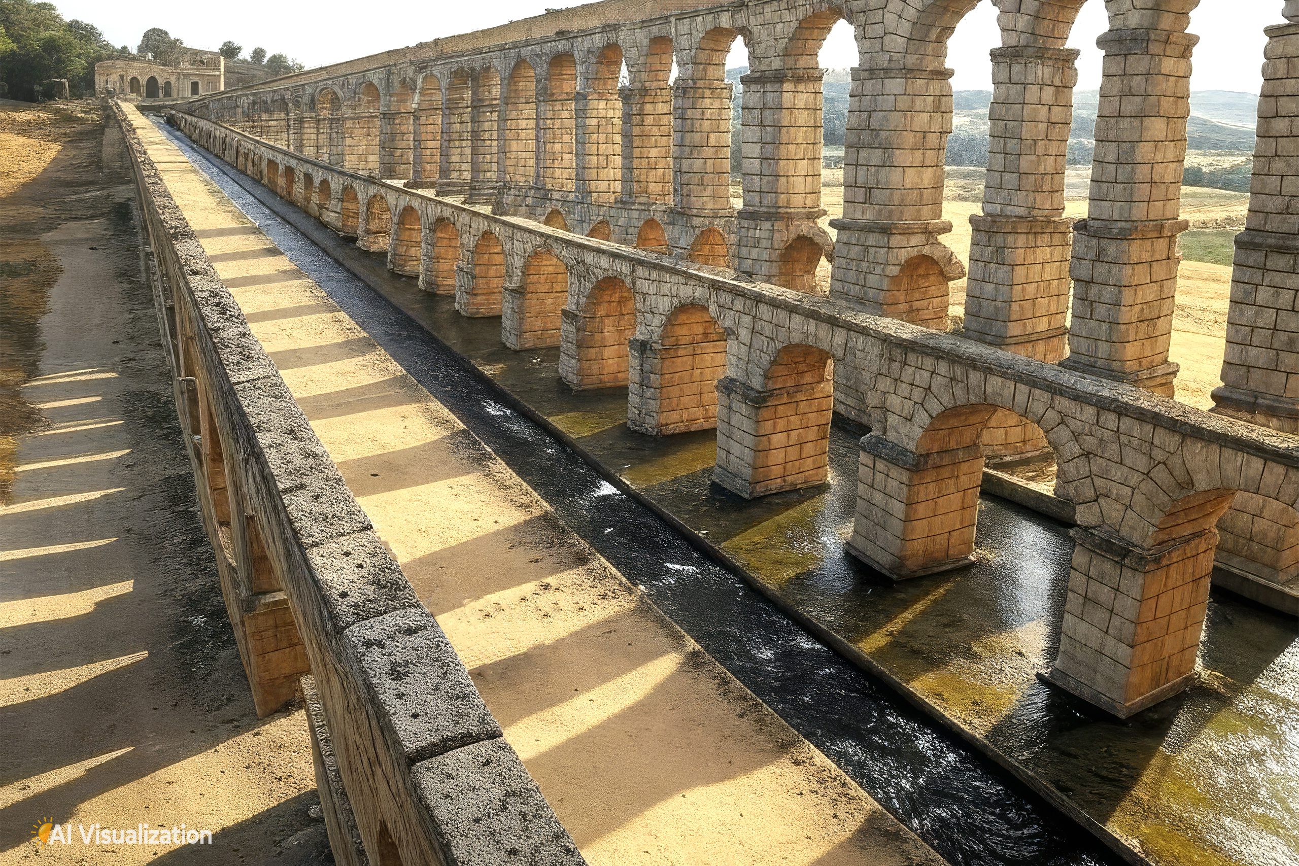 The dual-branch distribution system shows sophisticated planning. By splitting the flow near the city, engineers could serve different elevation zones and building types efficiently. The massive reservoir provided storage capacity that allowed the system to handle variations in demand and supply. The Romans understood that water infrastructure required redundancy and storage to function reliably.