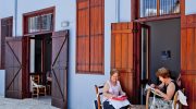One of the most distinctive sights in Pano Lefkara is not a monument, but a daily ritual. Women known locally as ploumarisses sit together in shaded streets or courtyards, stitching lace while talking, observing, and participating in village life. The street becomes both a social space and a workspace.