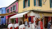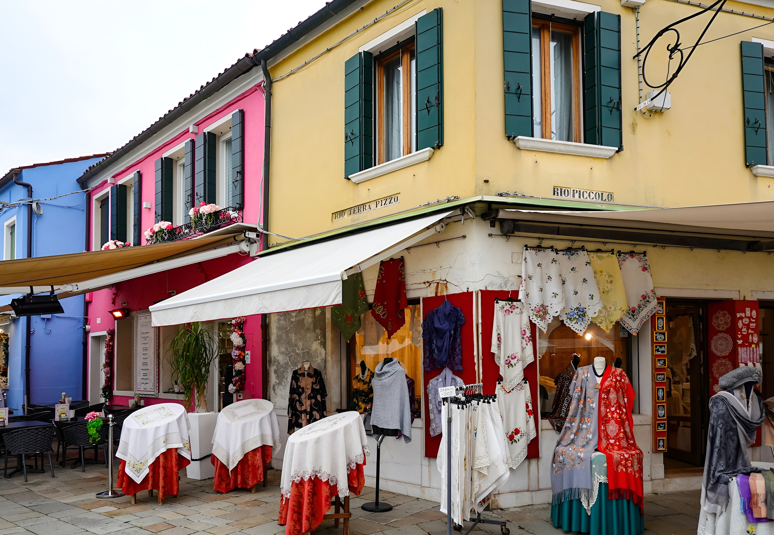 Further west, on the edge of the Venetian Lagoon, Burano presents a dramatically different but equally cohesive relationship between lace and urban space. Here, the built environment announces itself immediately through colour. Brightly painted houses line narrow canals, their reflections doubling the visual intensity of the streetscape.