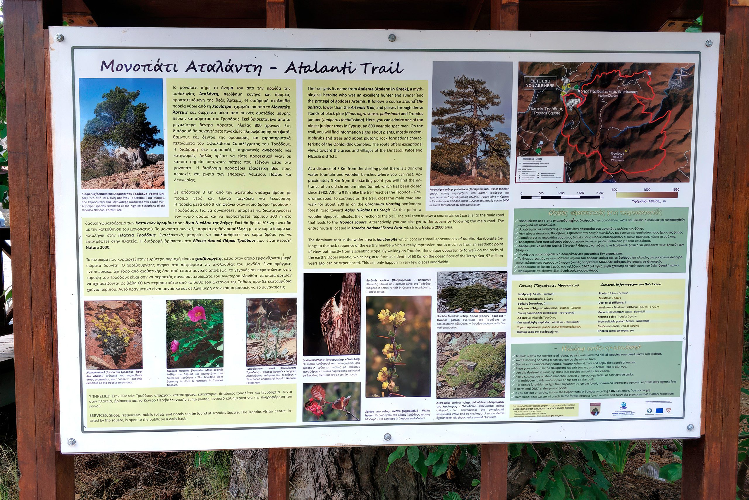 The Atalanti Nature Trail sits at 1,700 to 1,750 meters above sea level in the Troodos National Forest Park. The route starts and ends at Troodos Square, the main gathering point in the Troodos Mountains. Despite its 14-kilometer length, the trail maintains a relatively flat profile throughout most of its course, with only the final quarter showing noticeable elevation changes.