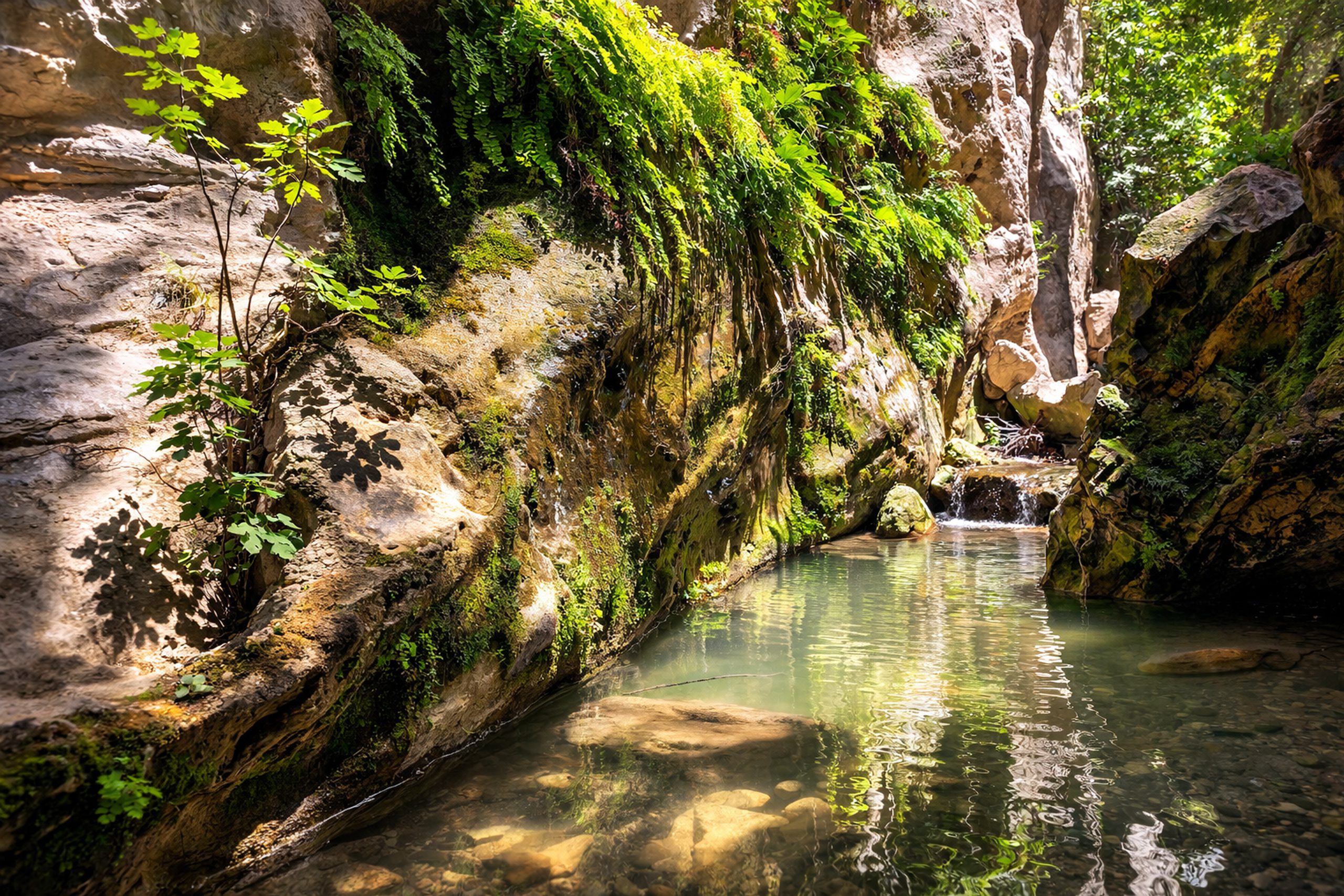 The microclimate inside Avakas Gorge allows plants to grow that wouldn’t normally survive in Cyprus’s dry climate. The narrow walls create shade and trap moisture, which means the gorge stays cooler and damper than the surrounding landscape. This allows ferns, wild figs, and other water-loving plants to thrive.