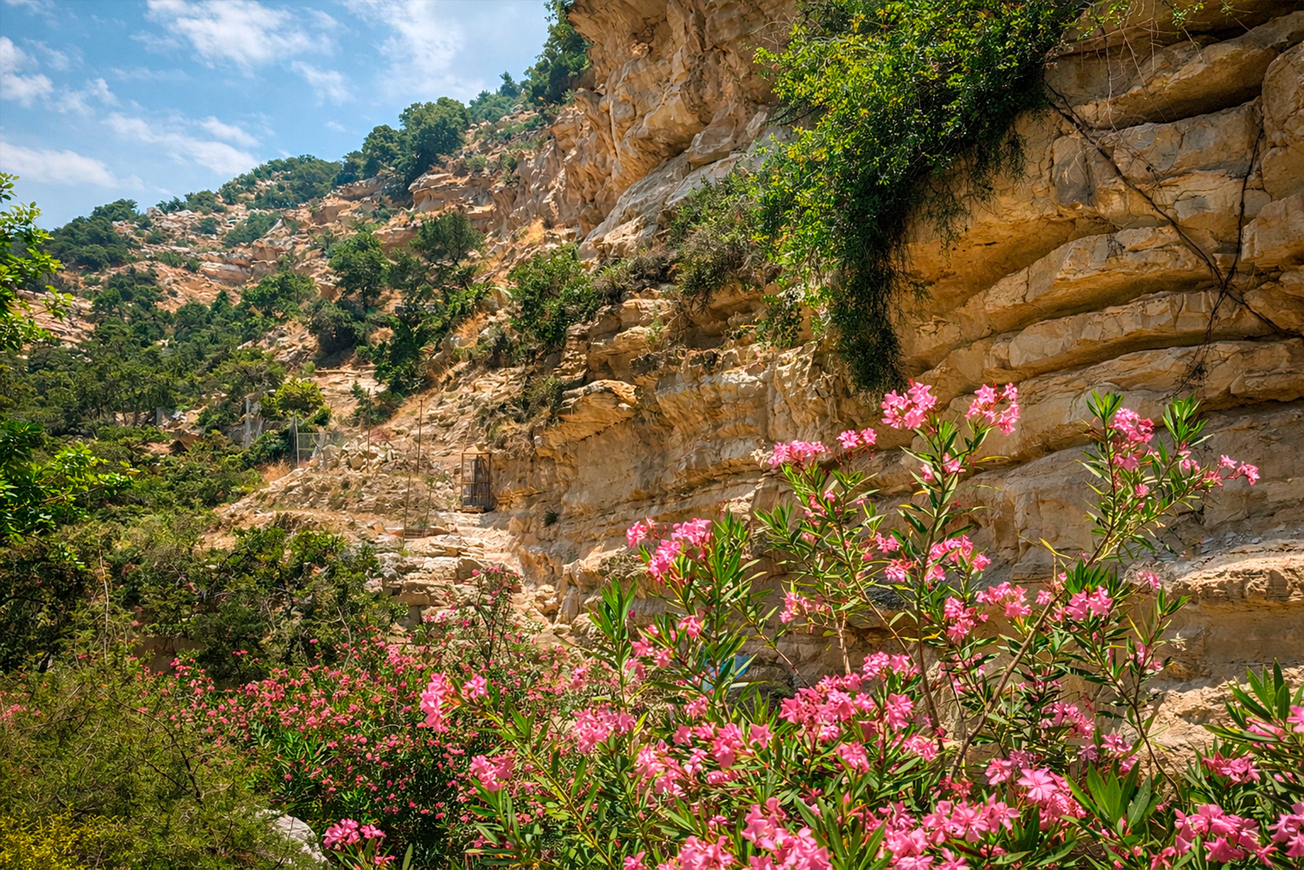 Wild fig trees grow directly from cracks in the rock walls where their roots find enough soil and moisture. These trees can live for decades despite having almost no soil, their roots penetrating deep into the limestone to find water. During the dry summer months when the riverbed is completely dry, these plants survive on moisture trapped in the porous rock.