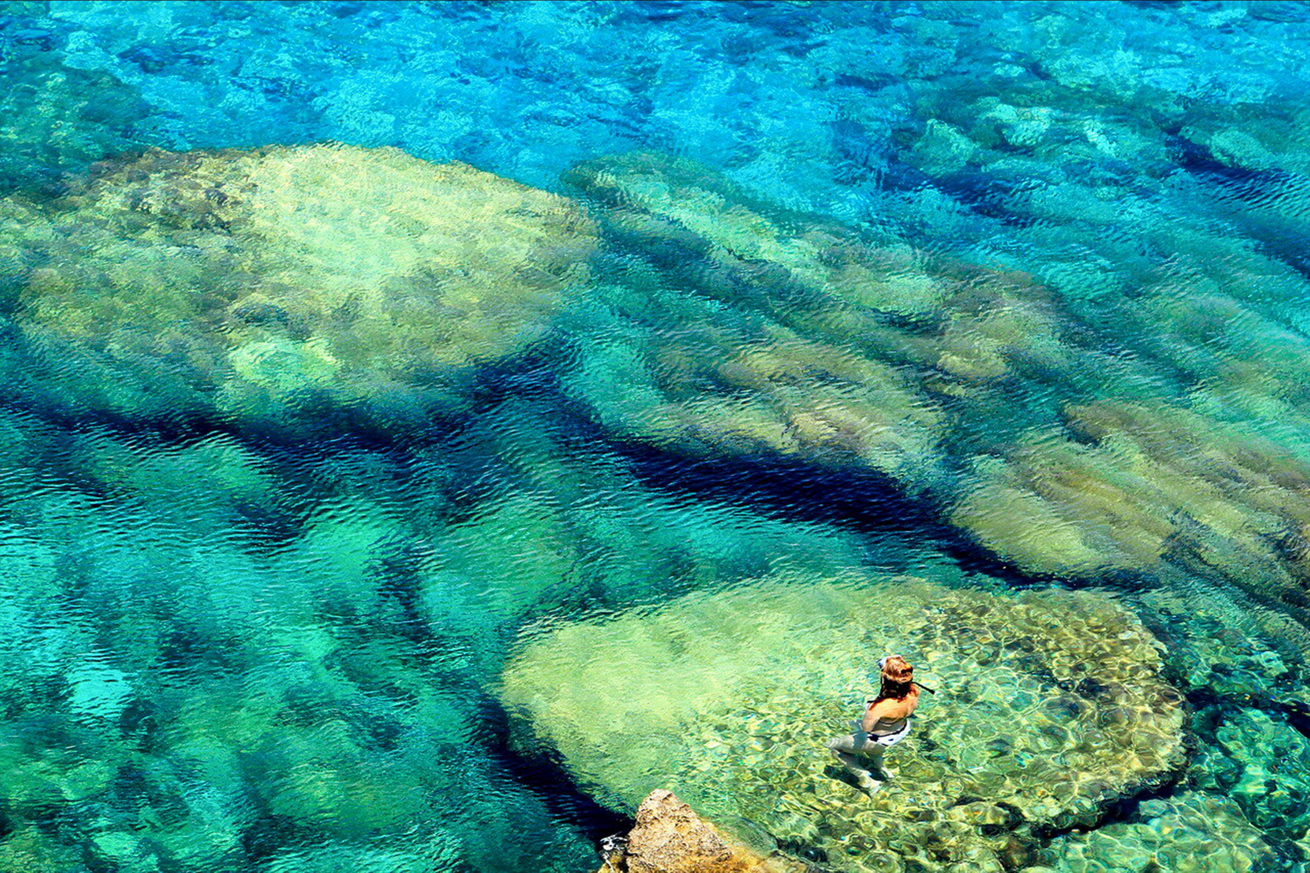 At one side of the cove, caves are partly submerged and swimmers can enter them by swimming. The water clarity is exceptional, often exceeding 20 meters of visibility, which makes swimming into caves relatively safe when conditions are calm. However, waves can suddenly increase and trap swimmers inside, so caution is essential.