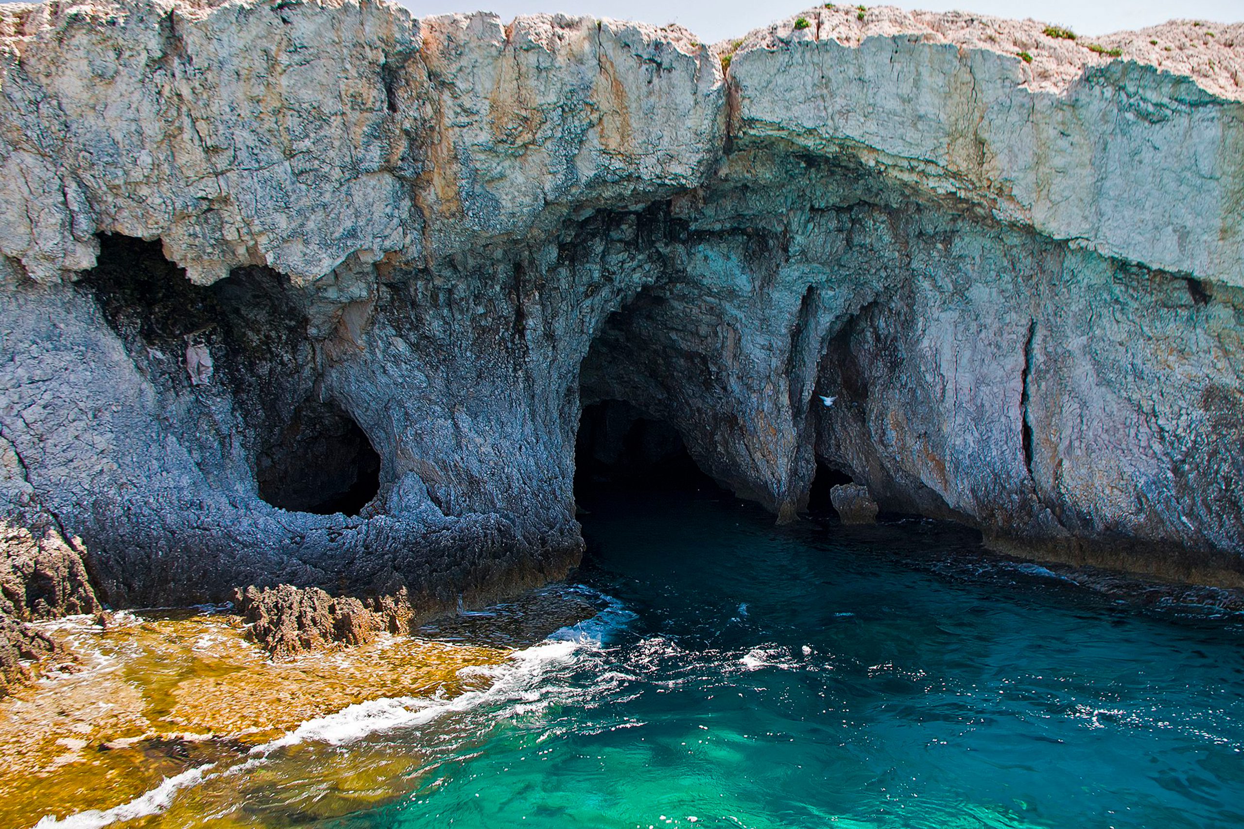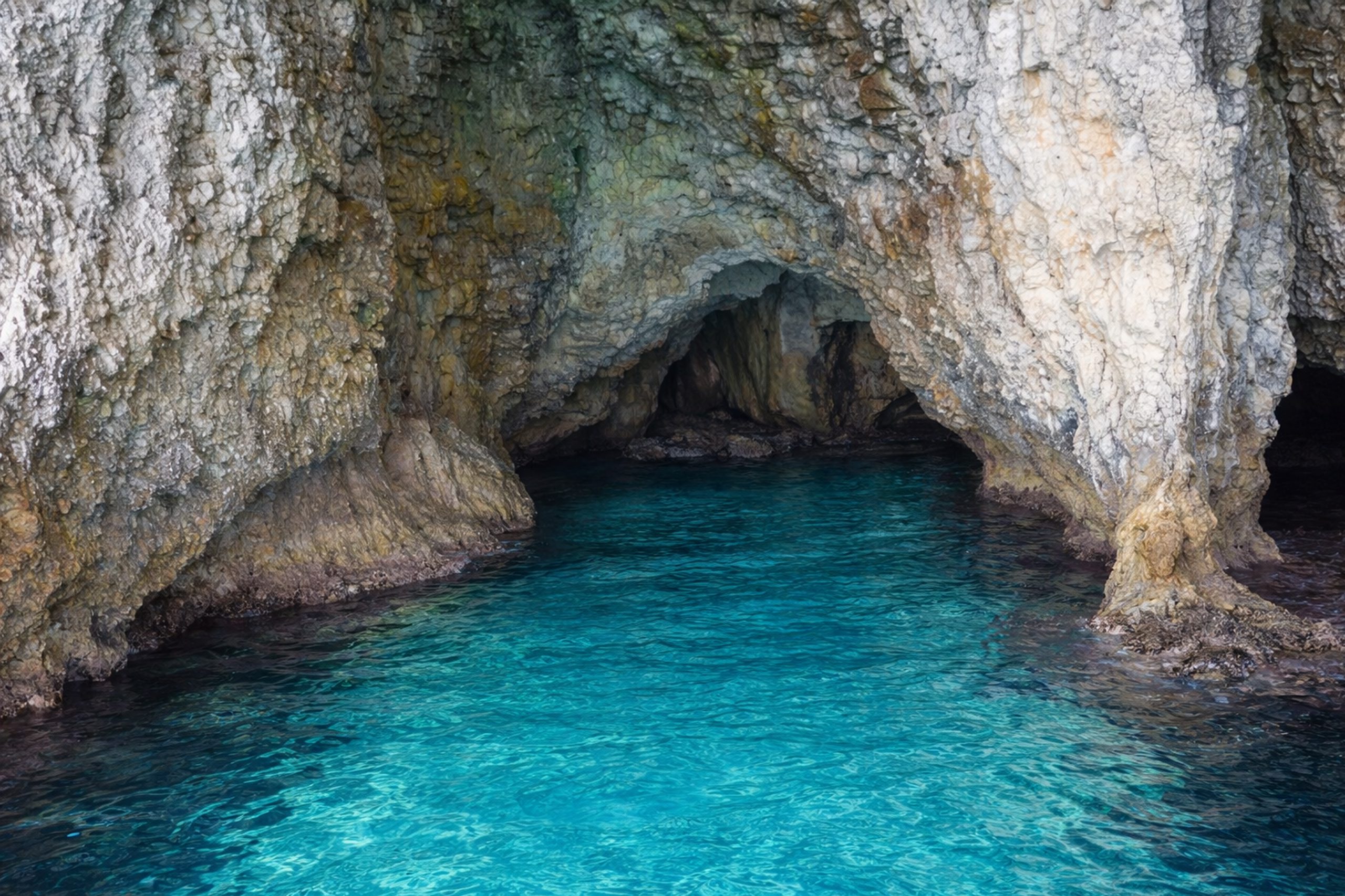 The caves are formed from layered limestone that was deposited in warm seas millions of years ago. The rock consists of hard and soft layers that erode at different rates. Waves constantly pound against the cliffs and dissolve the softer limestone faster than the harder layers above and below. This differential erosion creates the caves, arches, and tunnels that characterize the Cape Greco coastline.
