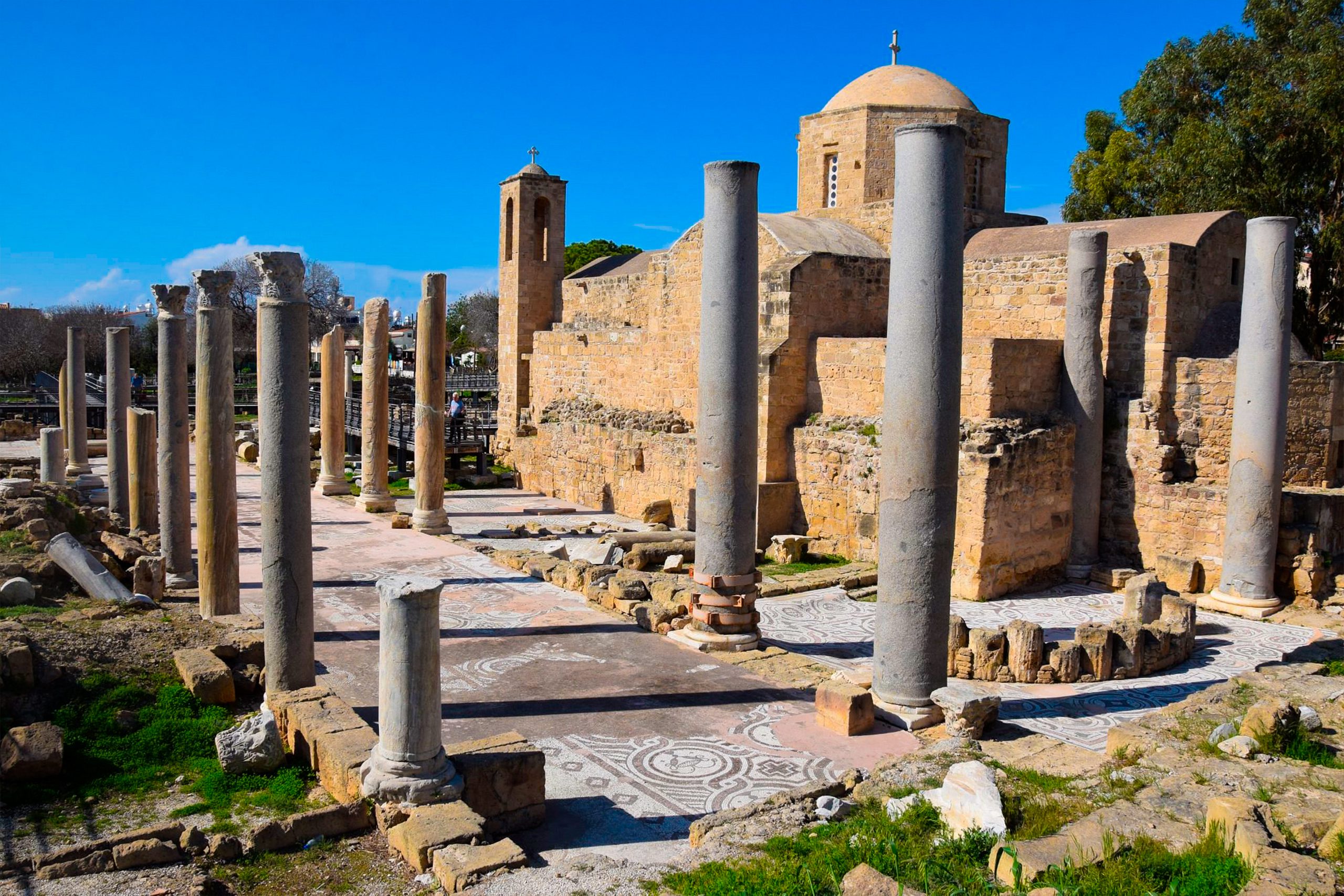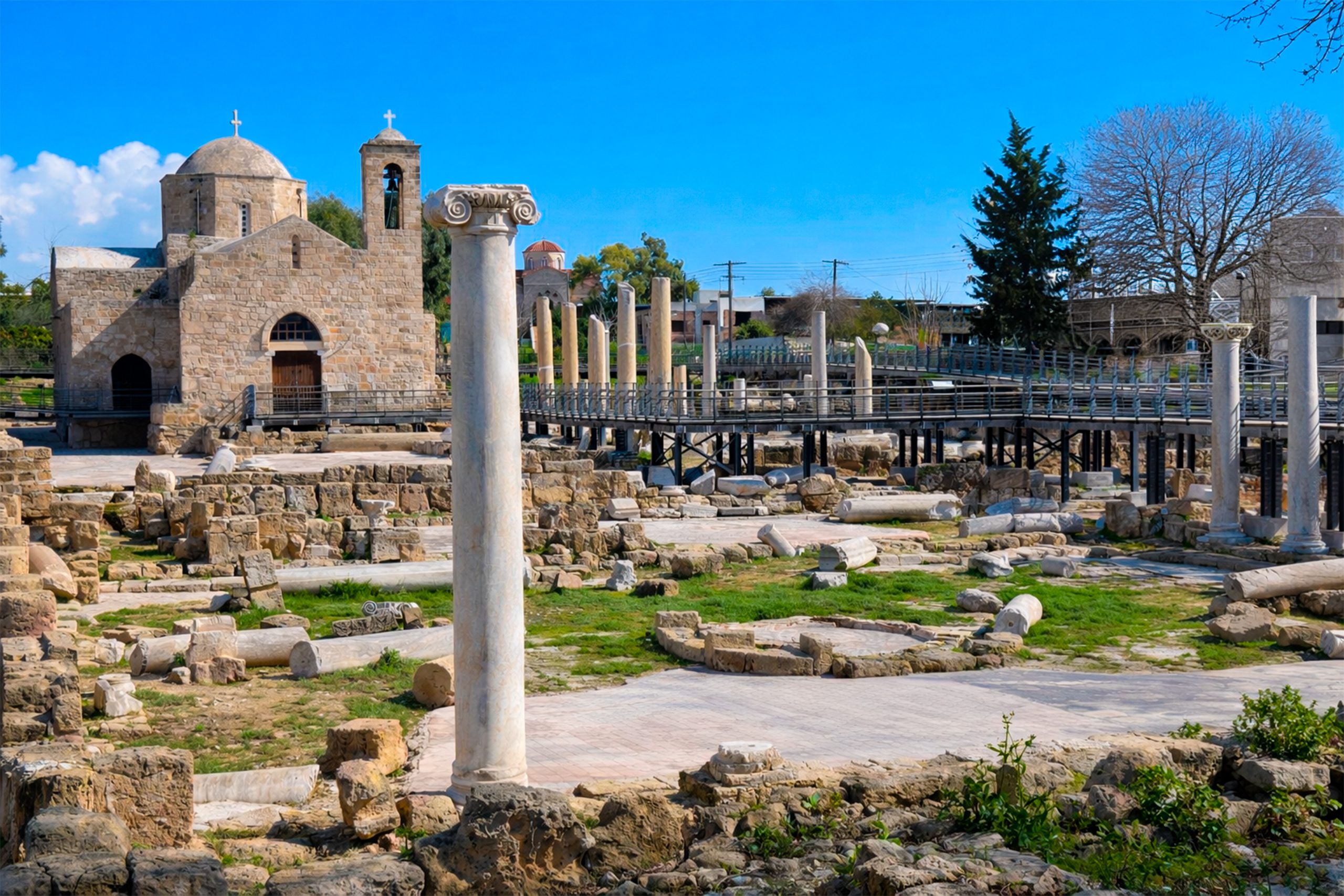 In the heart of Paphos stands a remarkable archaeological site where more than 1,600 years of Christian history remain visible. The Basilica of Chrysopolitissa, once the largest church in Cyprus, now reveals its ancient mosaics, towering columns, and a legendary pillar that connects this place to one of Christianity’s most influential figures.