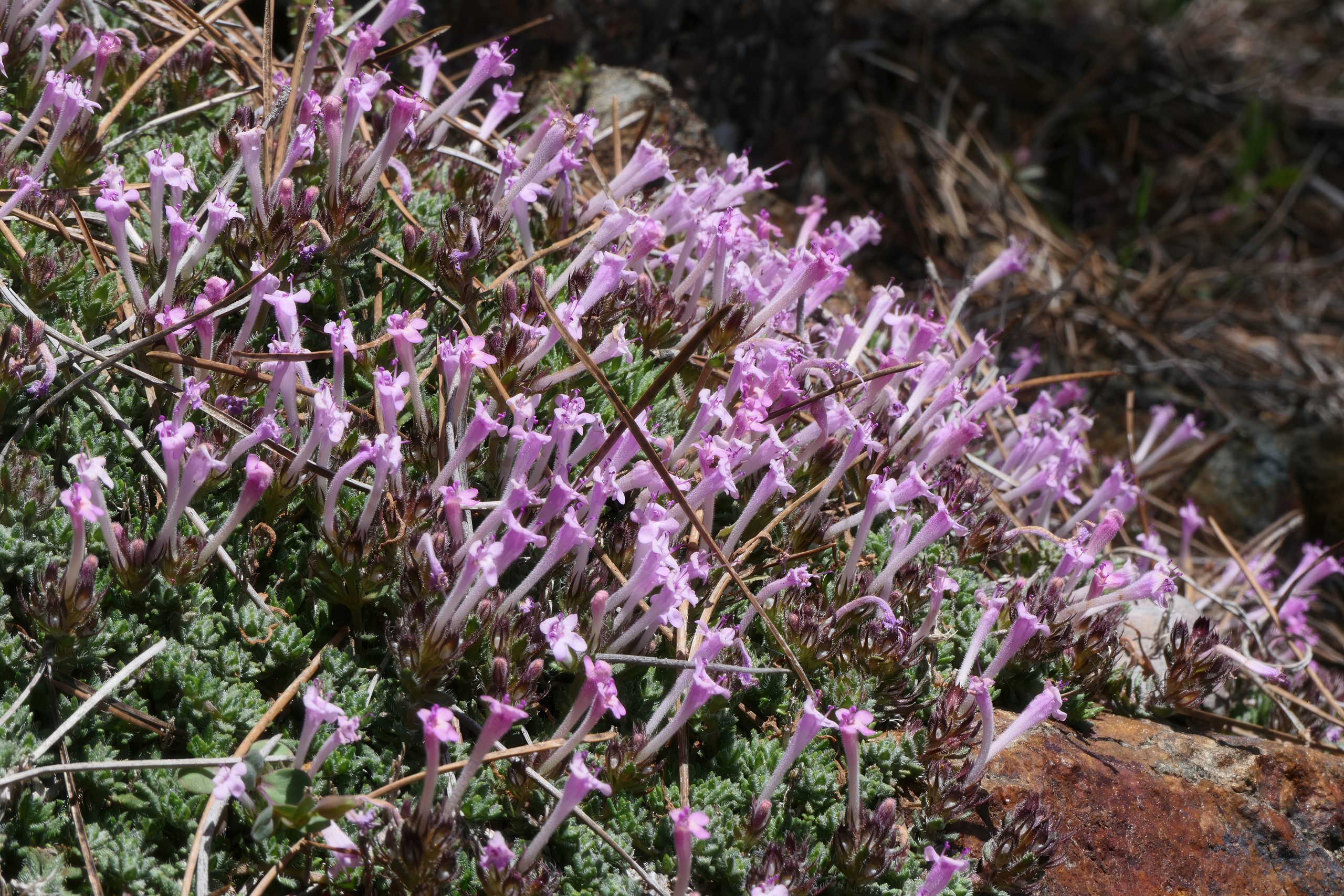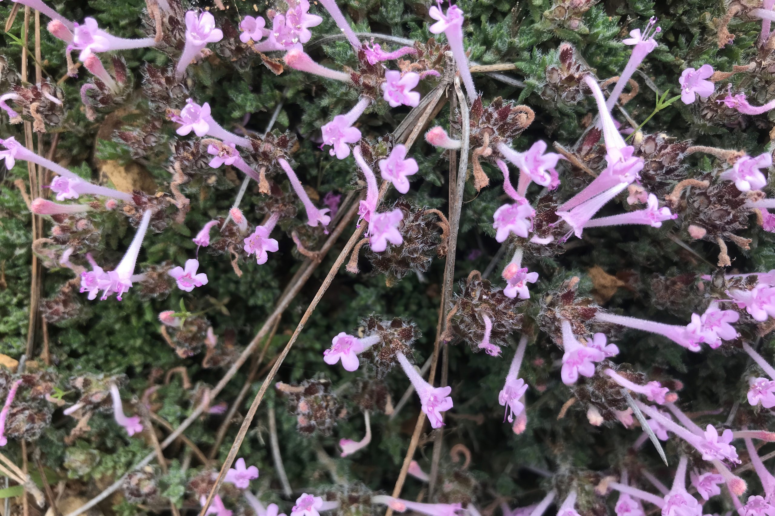Thyme grows as a low, bushy clump with thin, woody stems and small, fuzzy leaves that feel gentle yet tough under your fingers. In the heat of July, when much around it has withered, it sends up little spikes topped with pink or purple blooms, creating soft pockets of color against the stony earth.