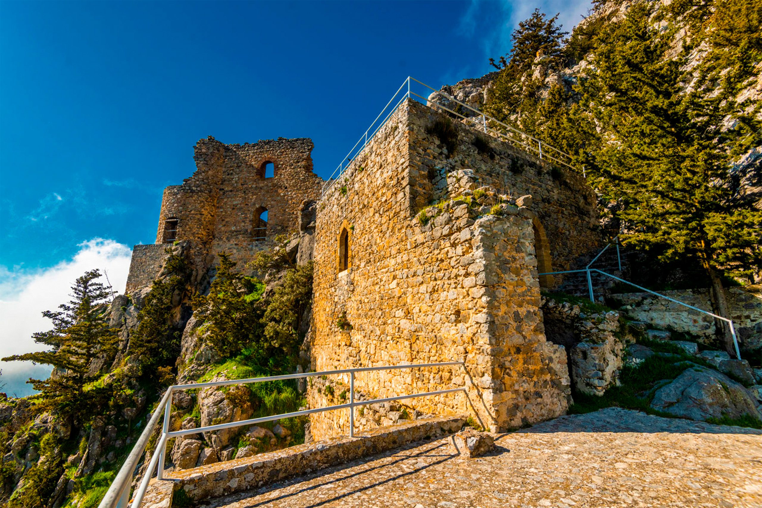 The castle is reached via a turn-off from the main Kyrenia to Famagusta road at the Pentadaktilos Pass, just after the Buffavento Restaurant. A narrow single-track road with passing places runs 6.8 kilometers along the southern slopes of the mountains to the parking area. The first portion can be rough and requires careful driving. The road passes through a military area with warning signs instructing drivers not to deviate from the marked route.