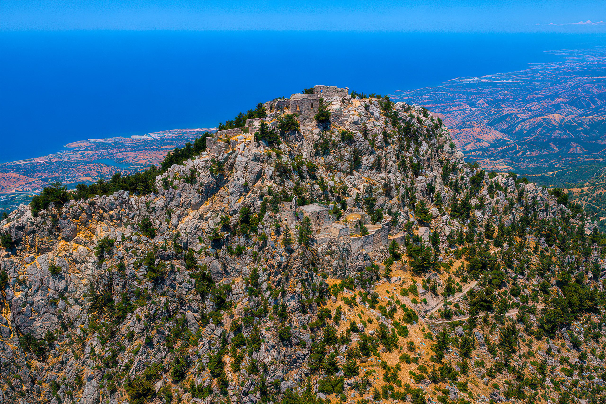 The location provides views in every direction. Looking north across the Mediterranean Sea, visitors can see the Turkish coast approximately 65 kilometers away on clear days. To the south, the Mesaoria Plain stretches toward Nicosia. On exceptionally clear days, Famagusta to the east and the Troodos Mountains to the south are visible. The castle overlooks nearly half the island from its rocky peak.