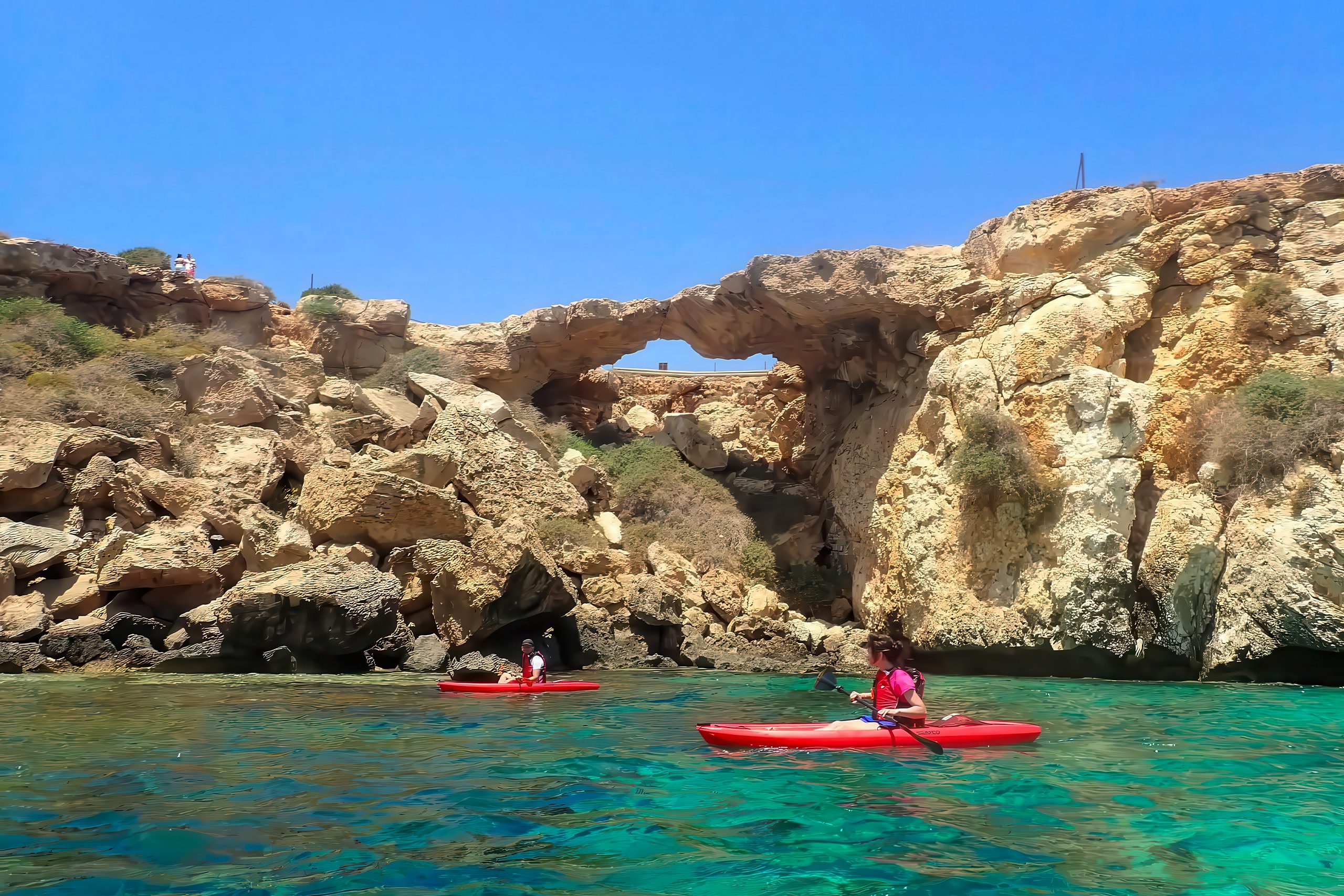 The structure extends from a coastal plateau into the Mediterranean, creating a bridge between land and sea. The surrounding coastline features additional sea caves, erosional notches, and wave-cut platforms that demonstrate the ongoing interaction between rock and water. Below the arch, the sea maintains exceptional clarity, revealing the rocky seabed and allowing excellent visibility for swimmers and snorkelers.