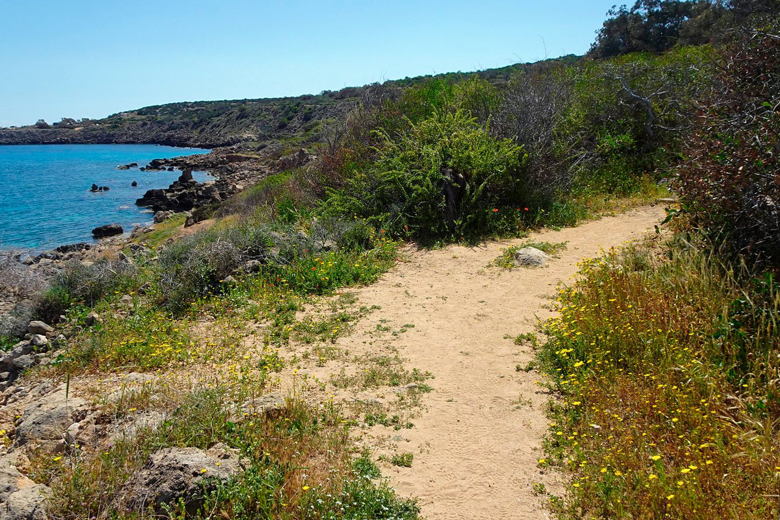 The Agioi Anargyroi to Sea Caves trail starts from an old quarry parking area, covers 2.5 km and takes about 45 minutes. Points of interest include fossilized marine organisms and a vantage point from which visitors can see as far as Stavrovouni Monastery. The trail passes through the natural arch formation known as Kamara tou Koraka before ascending slightly through shrub vegetation.
