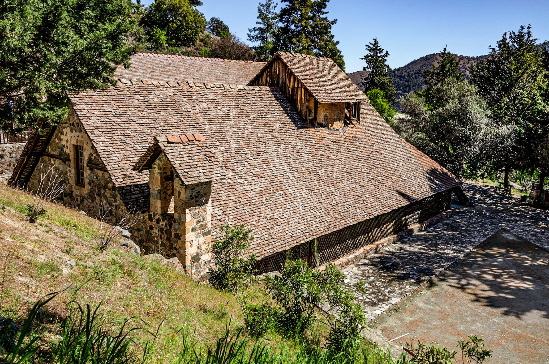 Architecturally, Panagia tou Araka is a small, single-aisled church with a dome over the central bay, following traditional Middle Byzantine ecclesiastical design. Its modest scale reflects its rural monastic setting rather than urban grandeur. The building is constructed from local stone and covered by a steep, timber-pitched roof that protects the structure from the harsh mountain climate, including heavy rainfall and seasonal snow. This protective roof, characteristic of many Troodos churches, played a crucial role in preserving the interior frescoes by shielding them from moisture and temperature fluctuations.