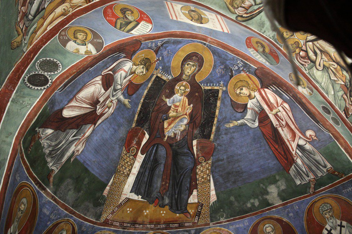 The dome features Christ Pantokrator, depicted with authority and compassion, surrounded by prophets and celestial figures that establish a hierarchical vision of the divine order. The walls below present scenes from the life of Christ and the Virgin Mary, arranged in a coherent narrative cycle that guides the viewer through key moments of salvation history. The compositions are balanced yet dynamic, reflecting the Comnenian interest in both harmony and expressive storytelling. The painter’s use of color is particularly notable, with subtle shading and luminous tones that enhance the spiritual atmosphere of the interior.