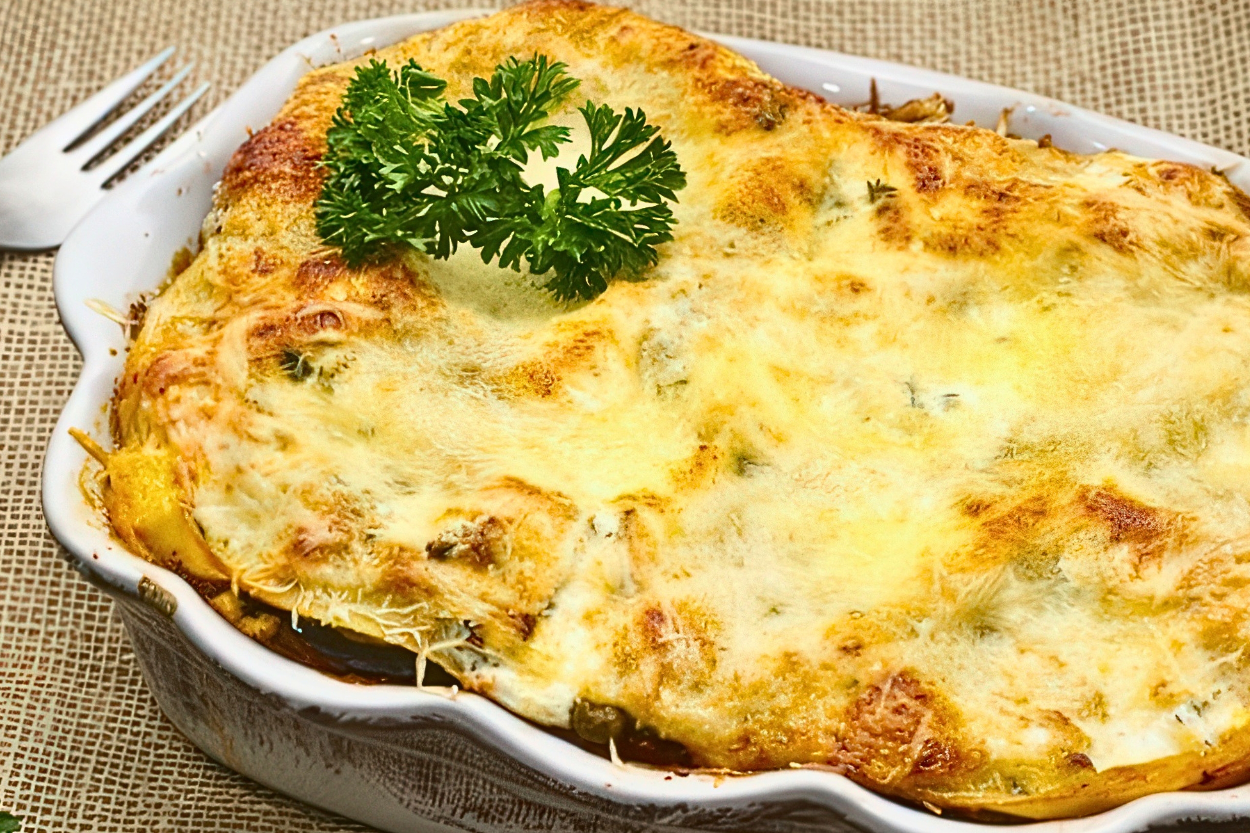 The sauce gets enriched with egg yolks and cheese, creating a thicker, more substantial topping than standard French béchamel. Traditional preparation involves mixing some béchamel into the meat layer as well, which helps bind the ingredients and adds moisture throughout the dish.