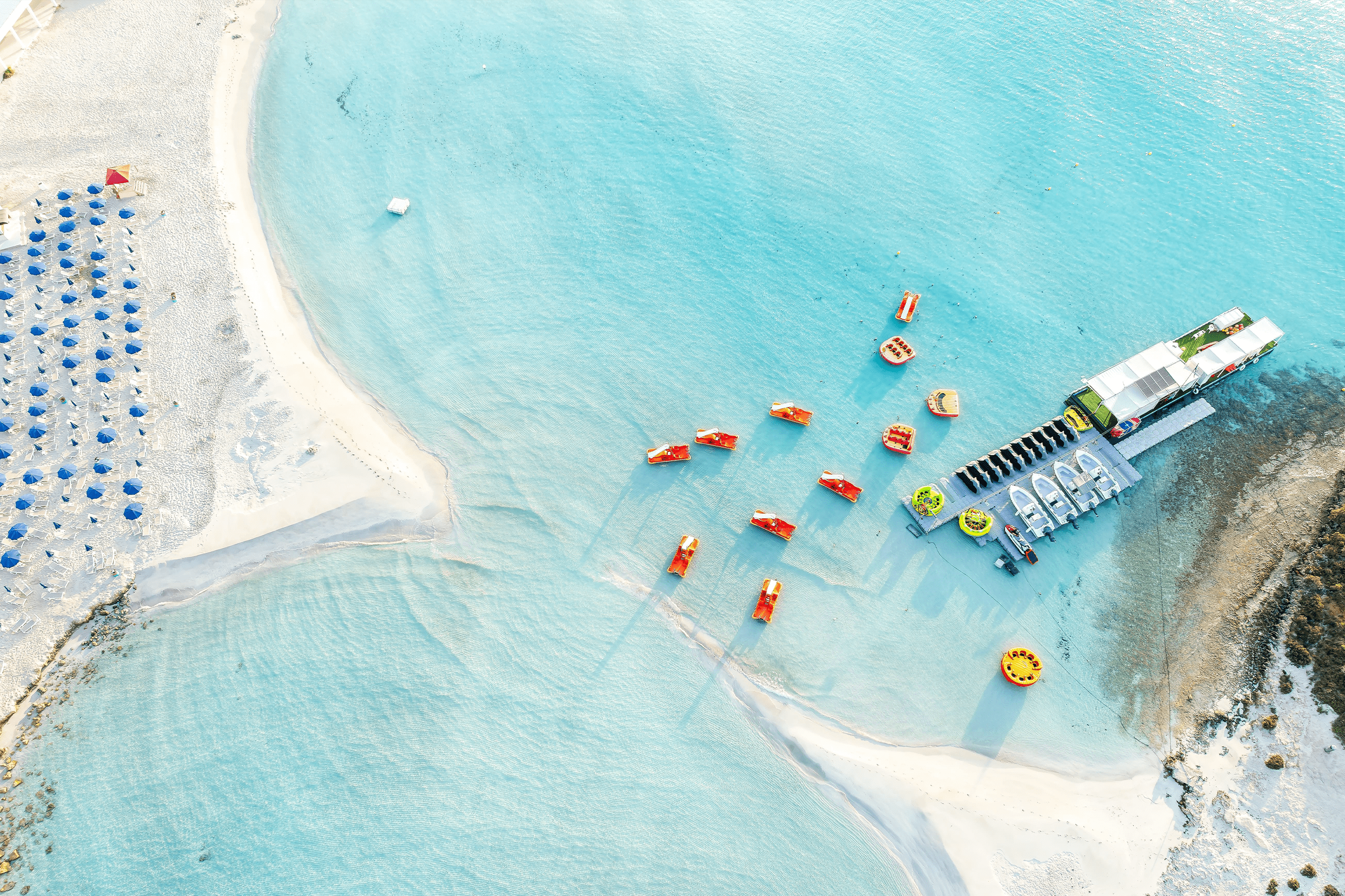 Nissi Beach stands as probably the most popular beach in Cyprus, stretching 500 meters with white sand and turquoise water. The water after entering remains quite shallow for a long distance and stays crystal clear with minimal waves. Nissi Beach got its name from an islet not far from the coast that visitors can reach when the tide is low in winter and spring, as a sand walkway unveils leading from the beach to the small island inhabited by low-level shrubs and pretty plants.