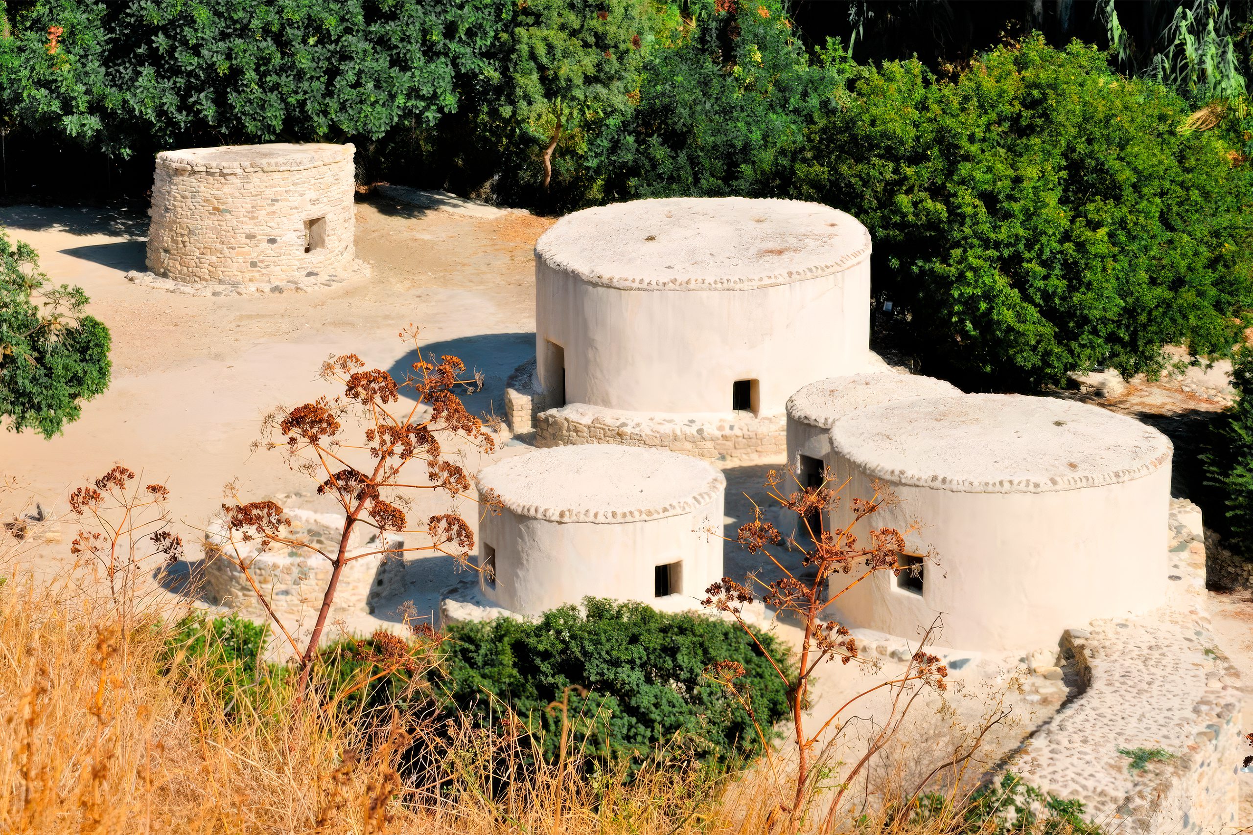 The Neolithic settlement of Khirokitia, situated in the Maroni River valley about 6 kilometers from the sea, represents one of the most important prehistoric sites in the eastern Mediterranean. Occupied from the 7th to the 4th millennium BC, the settlement demonstrates an organized functional society with collective fortifications for communal protection. Inhabitants practiced sophisticated agriculture, cultivating wheat, barley, lentils, peas, horse beans, and vetch. They foraged for olives, flax, figs, pistachios, plums, and pears while herding sheep, goats, and pigs.