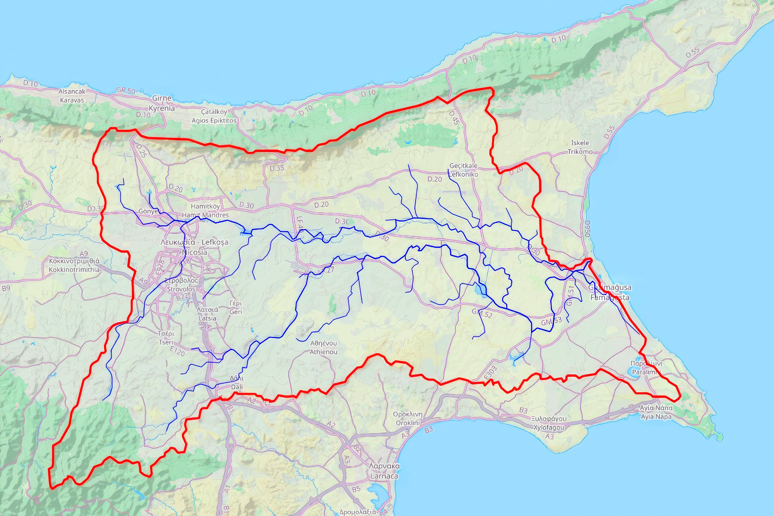 Cyprus contains approximately 35 streams and rivers, though most qualify as temporary watercourses that flow only during winter rains. These rivers create fertile valleys that have supported agricultural communities for over 9,000 years. The island receives an estimated 600 million cubic meters of usable runoff from annual rainfall, a limited resource distributed unevenly across the landscape. Major rivers, including the Pedieos, Kouris, Xeros, Vasilikos, and Diarizos originate in the Troodos Mountains, flow through productive valleys, and terminate either at the Mediterranean coast or in modern reservoir systems.