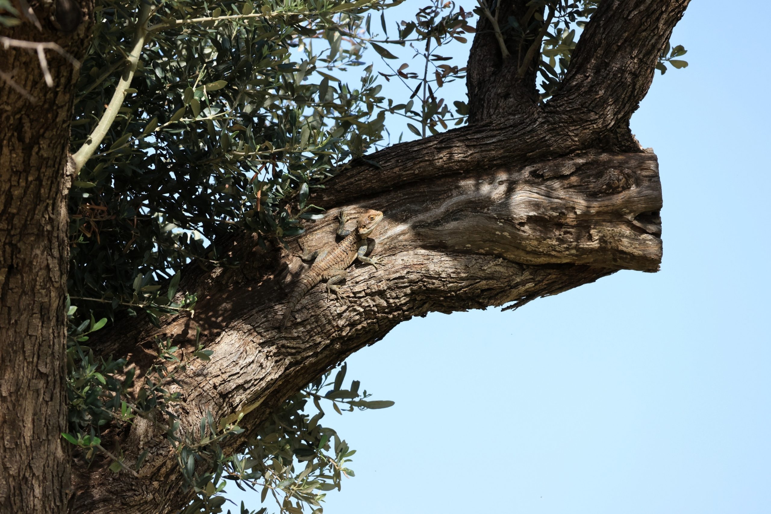 Zooming into its biology, the kourkoutas is a diurnal insectivore, munching on snails, caterpillars, beetles, and even small birds or fruits when available. Reproduction kicks off in spring, with females laying 3-10 leathery eggs in rocky crevices twice a year – no parental care needed, as hatchlings fend for themselves right away. Genetically, studies show it’s diverged from Turkish populations, with unique scale arrangements and behaviors like territorial head-banging. Botanically, it thrives amid Cyprus’ endemic plants like the golden oak (Quercus alnifolia) in Troodos forests, helping control insect pests in olive groves and pine woods. Agamas are a perfect tree climbers and could be often spotted on pines, olives and carob trees.
