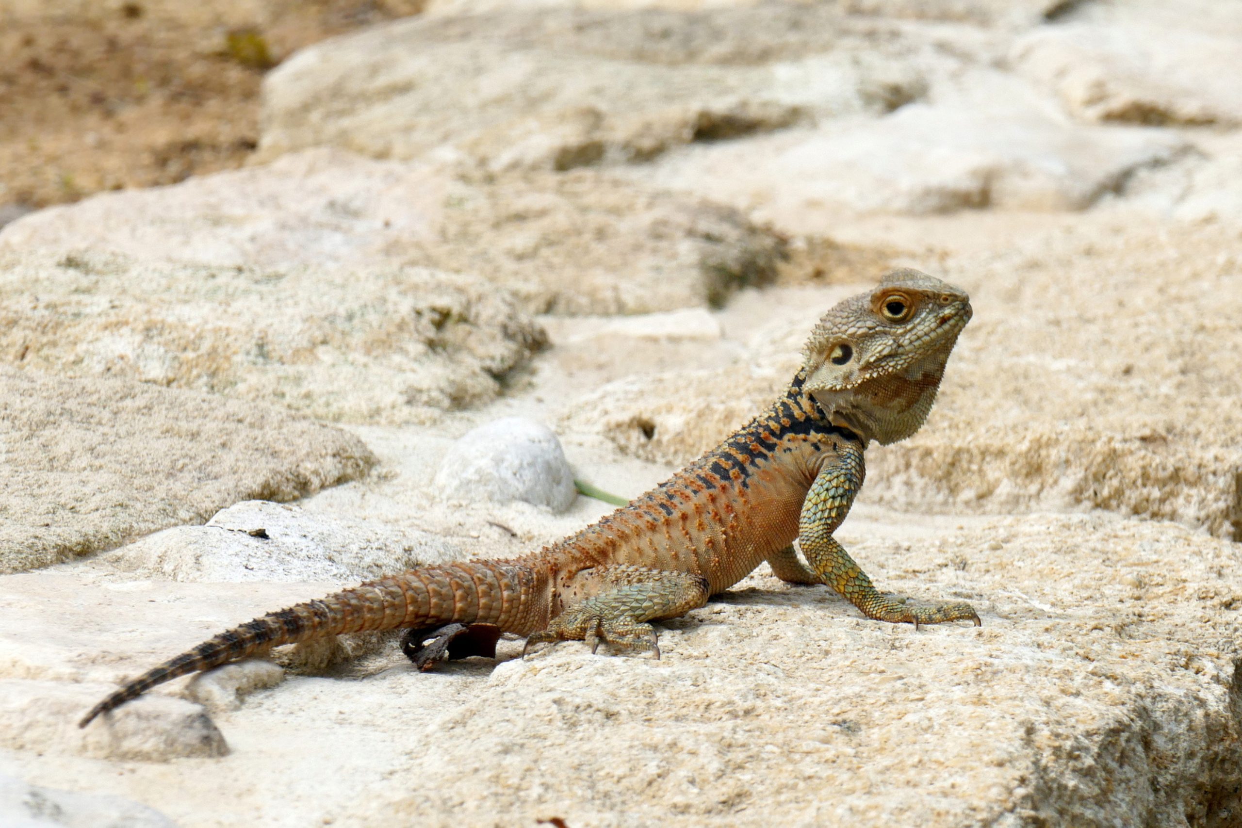 The kourkoutas belongs to the agama family, a group of lizards with roots stretching back to ancient times across Asia, Africa, and Europe. Its scientific name, Stellagama stellio cypriaca (or more correctly Laudakia cypriaca), highlights its starry appearance and Cypriot origins. Fossil records and genetic studies suggest its ancestors arrived on Cyprus during the late Pleistocene, evolving in isolation to become a unique subspecies. Unlike its mainland cousins in Turkey and Greece, which share similar thorny skins but differ in subtle scale patterns and colors, the Cypriot version adapted to the island’s dry, rocky world – perhaps hitching a ride on drifting vegetation during geological upheavals like the Messinian Salinity Crisis millions of years ago.