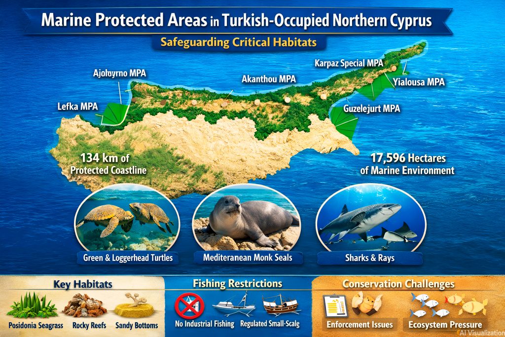 Five coastal Marine Protected Areas established in the Turkish-occupied part of Cyprus since 2009 safeguard critical habitats and species along approximately 134 kilometers of coastline, encompassing around 17,596 hectares of marine environment. This represents about one fifth of the island’s total coastline. The establishment followed extensive research that identified key biodiversity features including Posidonia meadows, rocky reefs, and sandy bottoms that support endangered green and loggerhead sea turtles, Mediterranean monk seals, and various sharks and rays.