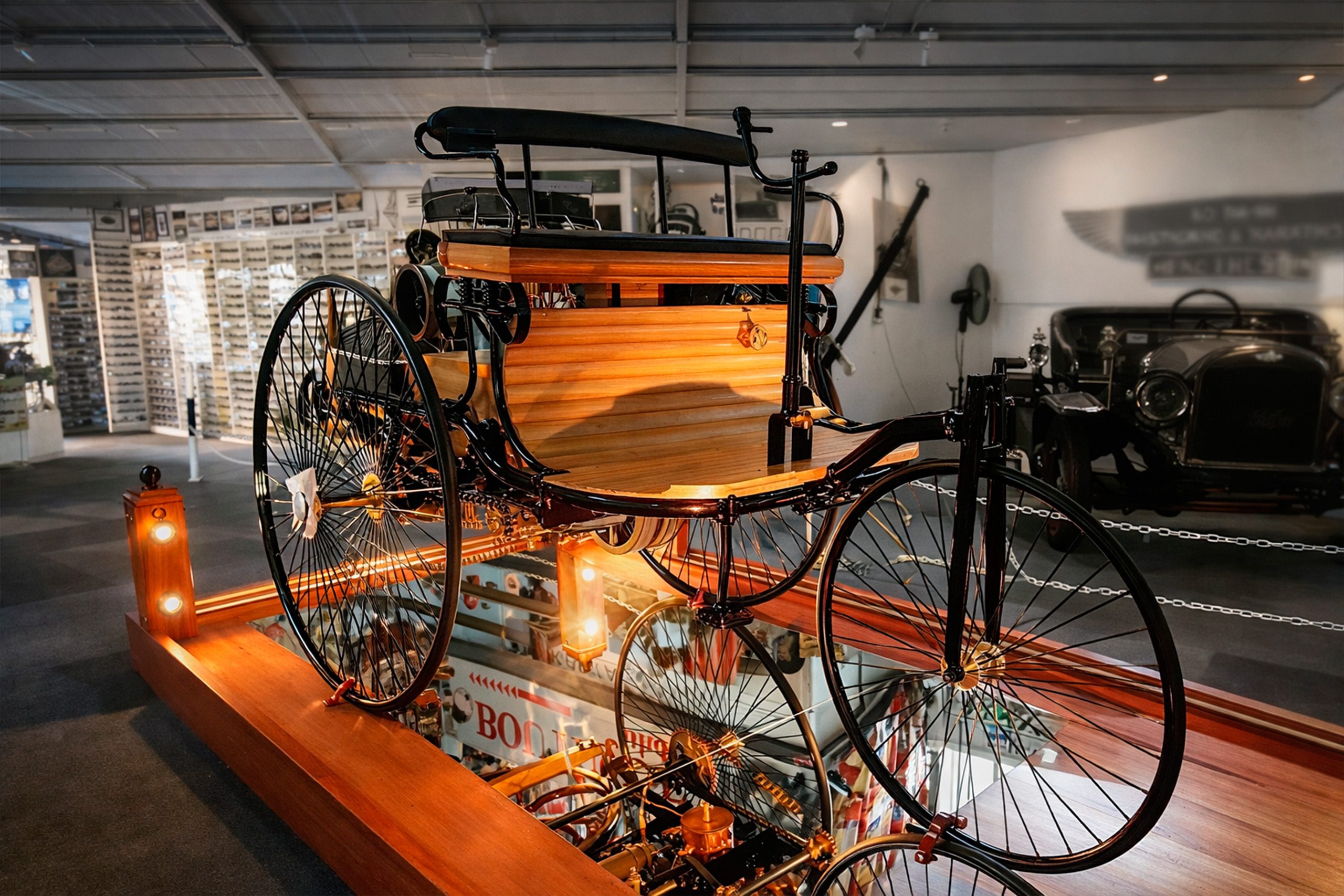 The museum’s replica captures the details of this revolutionary vehicle. Only about 25 original Patent Motorwagens were built between 1886 and 1893, making this replica a valuable educational piece that shows visitors how automotive technology began.