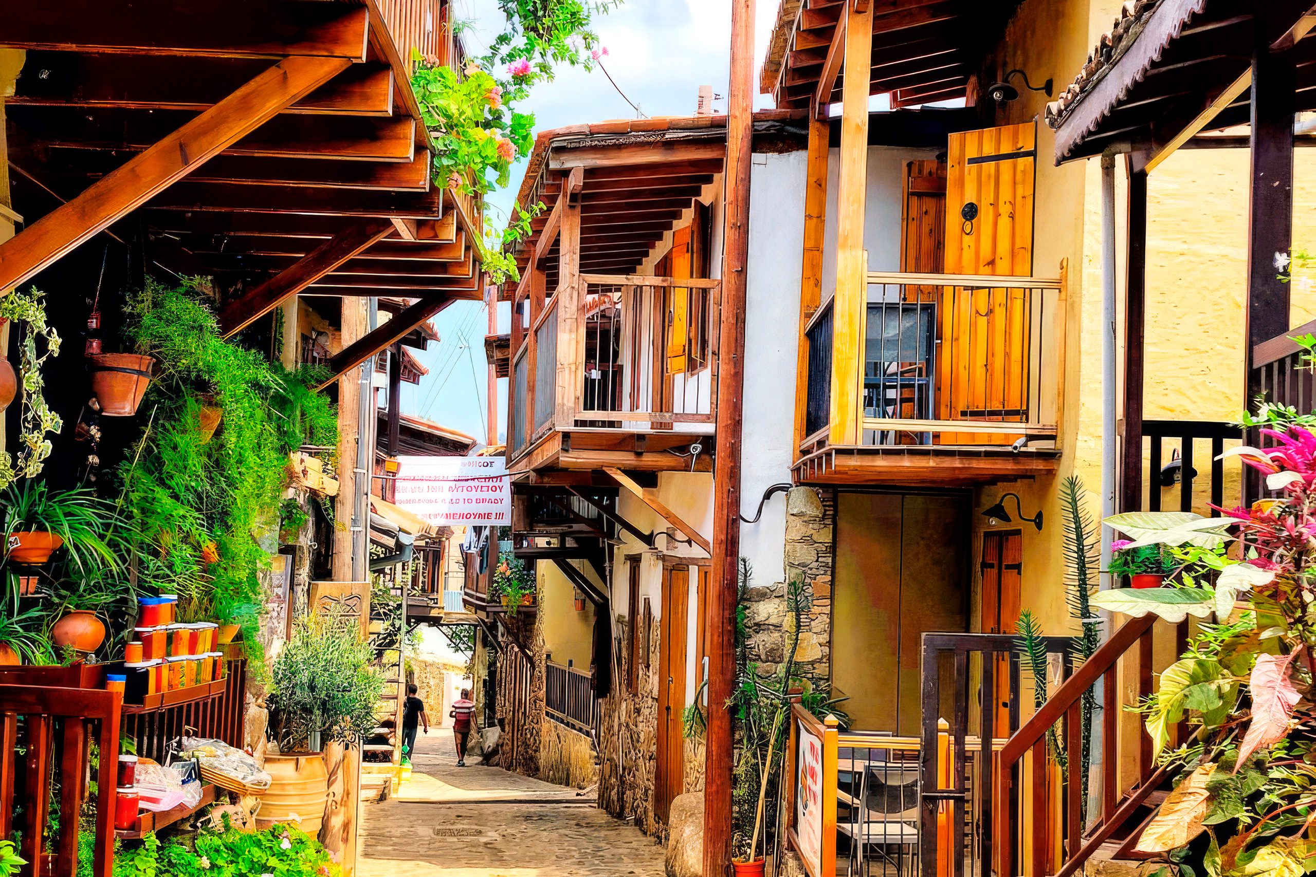 Kakopetria preserves one of the finest examples of traditional mountain architecture. The old quarter features stone houses with wooden balconies, built close together along narrow cobblestone alleys. Roofs nearly touch, creating covered passages that provide shade while allowing air circulation. This dense construction pattern dates to Byzantine times and served multiple purposes beyond cooling, including defense and efficient land use on steep slopes.