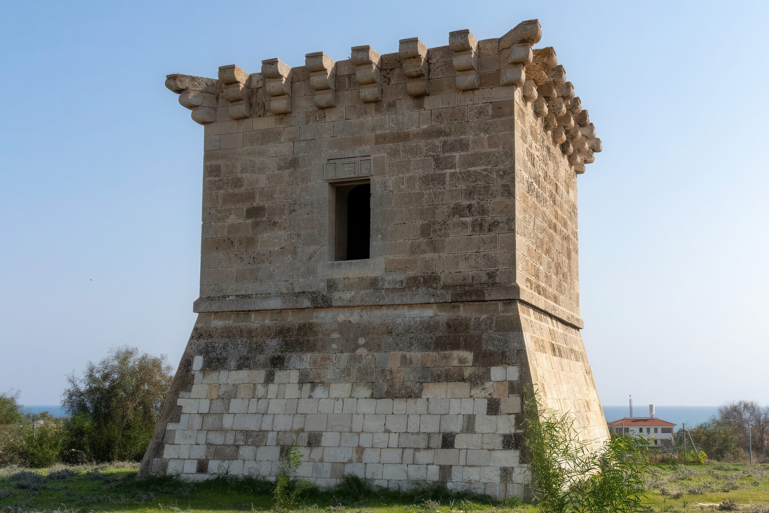 Stone-built houses line the waterfront streets in villages across Cyprus. Walls are typically thick, constructed from local limestone, sandstone, or granite. Small windows face the sea to let in light while protecting against wind and heat. Wooden shutters painted in blue or green add color to the neutral stone facades. Red clay tiles cover the roofs.