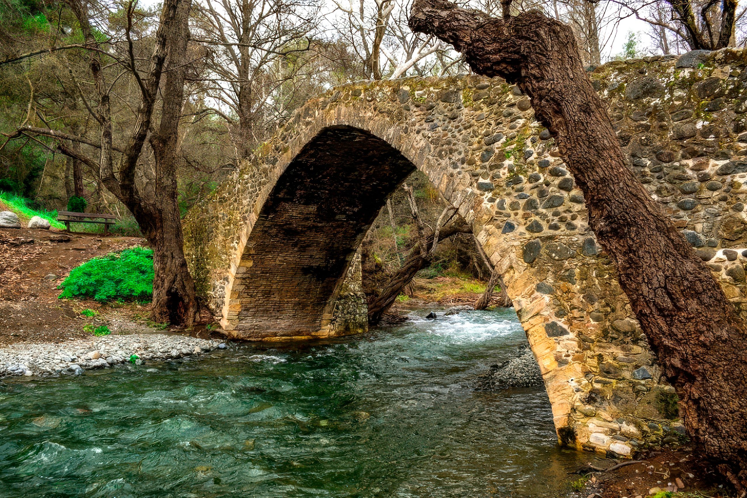 The route winds along the riverbed, occasionally crossing the water as it passes through the historic Venetian bridge at Tzelefos. Built during the medieval period, this stone bridge stands as the largest of its kind ever constructed in Cyprus. The surrounding 11 kilometer gorge features dense pine forests with some of the tallest trees found anywhere on the island. Photographers and newly married couples frequently visit this scenic location.