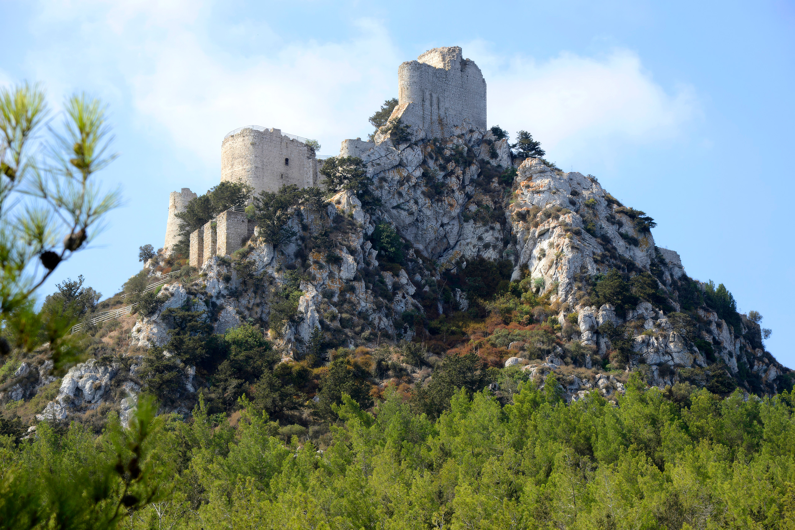 The castle lies about 20 kilometers southeast of Kyrenia in the northeastern Kyrenia range. The drive follows winding mountain roads through forested areas and small villages.