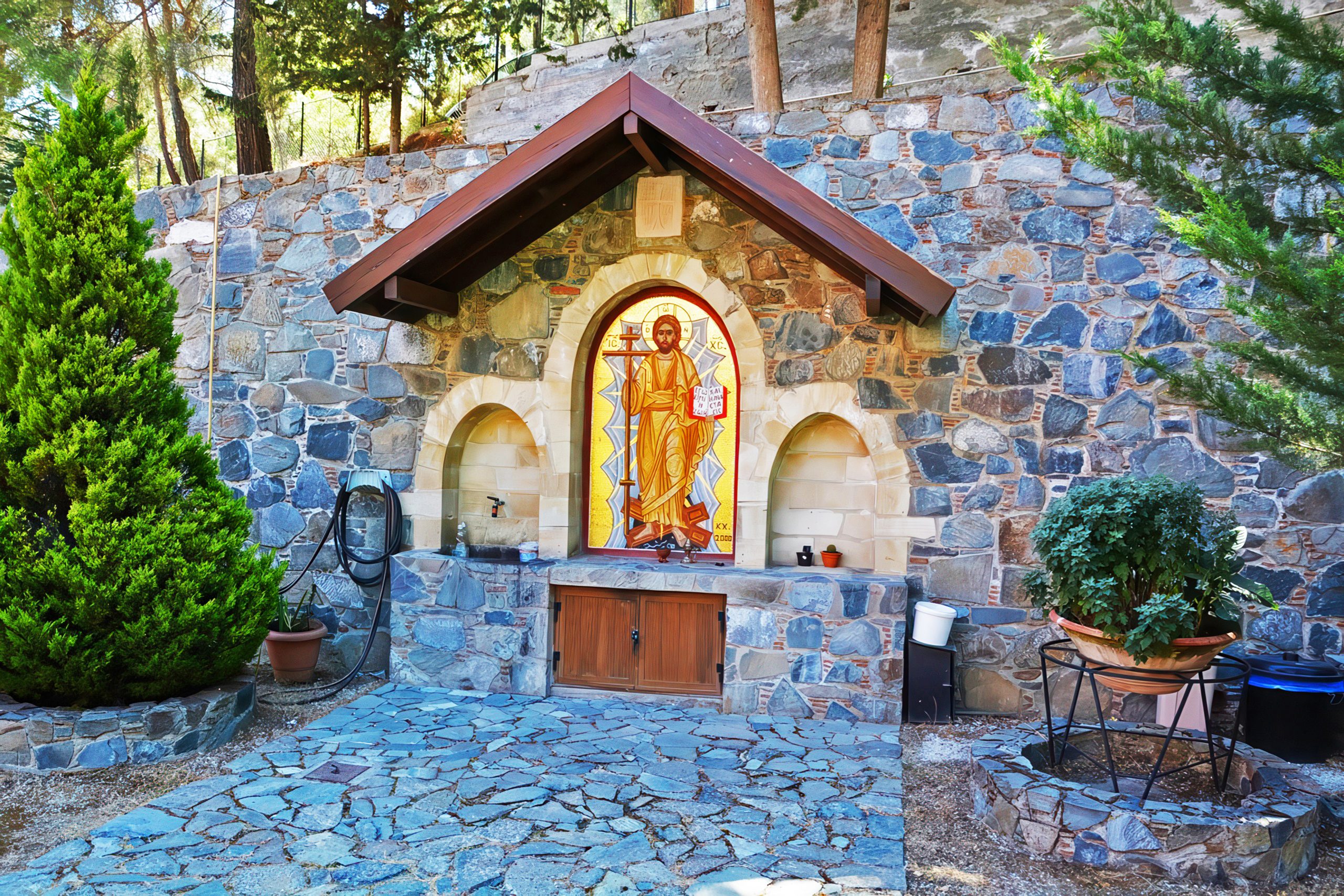 The monastery sits approximately 40 kilometers from Nicosia and can be reached by car via mountain roads through villages like Lazanias. The drive takes roughly one hour from the capital. The surrounding Machairas forest offers hiking trails and picnic areas for visitors wanting to explore the natural setting. Parking is available near the monastery entrance at no charge.