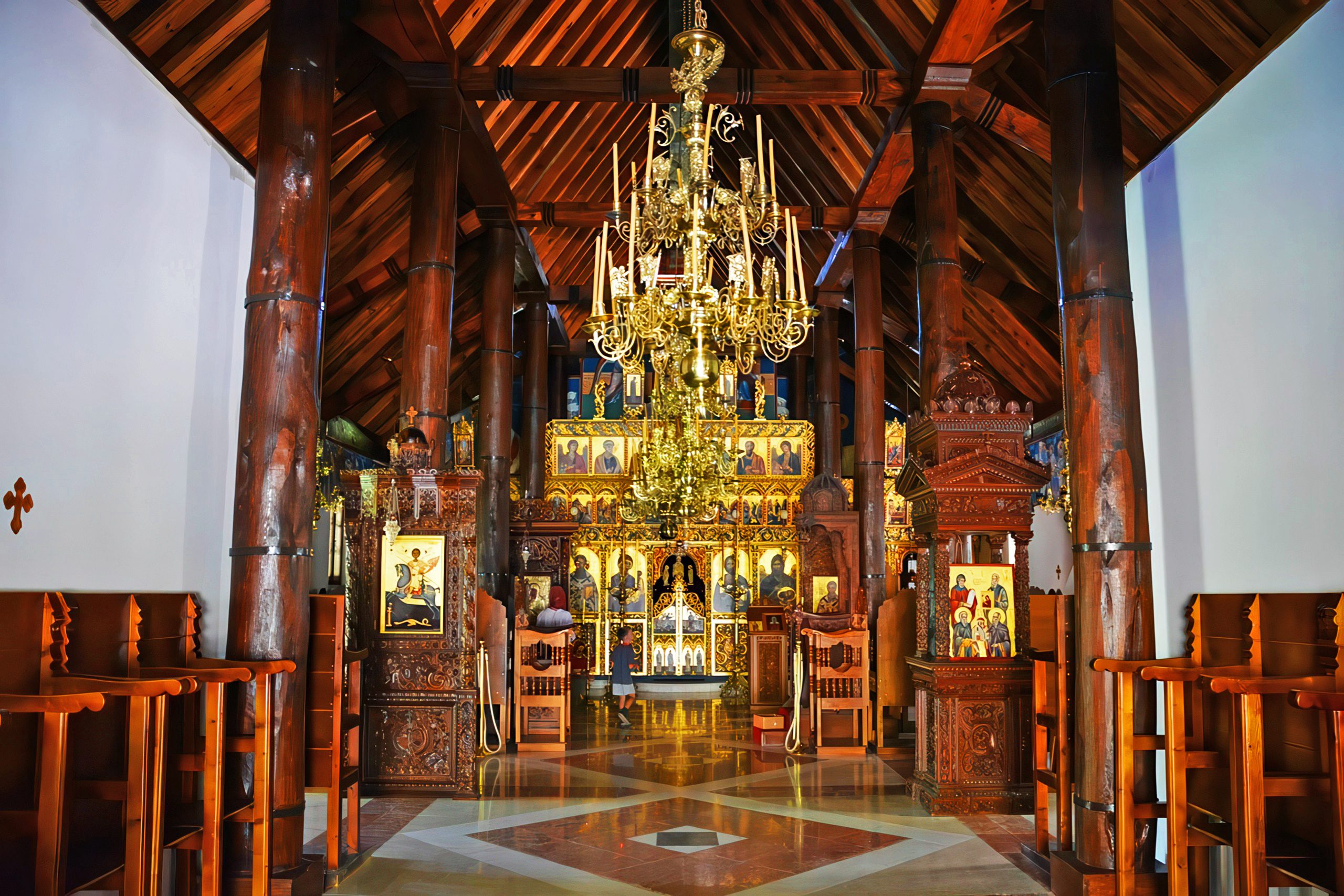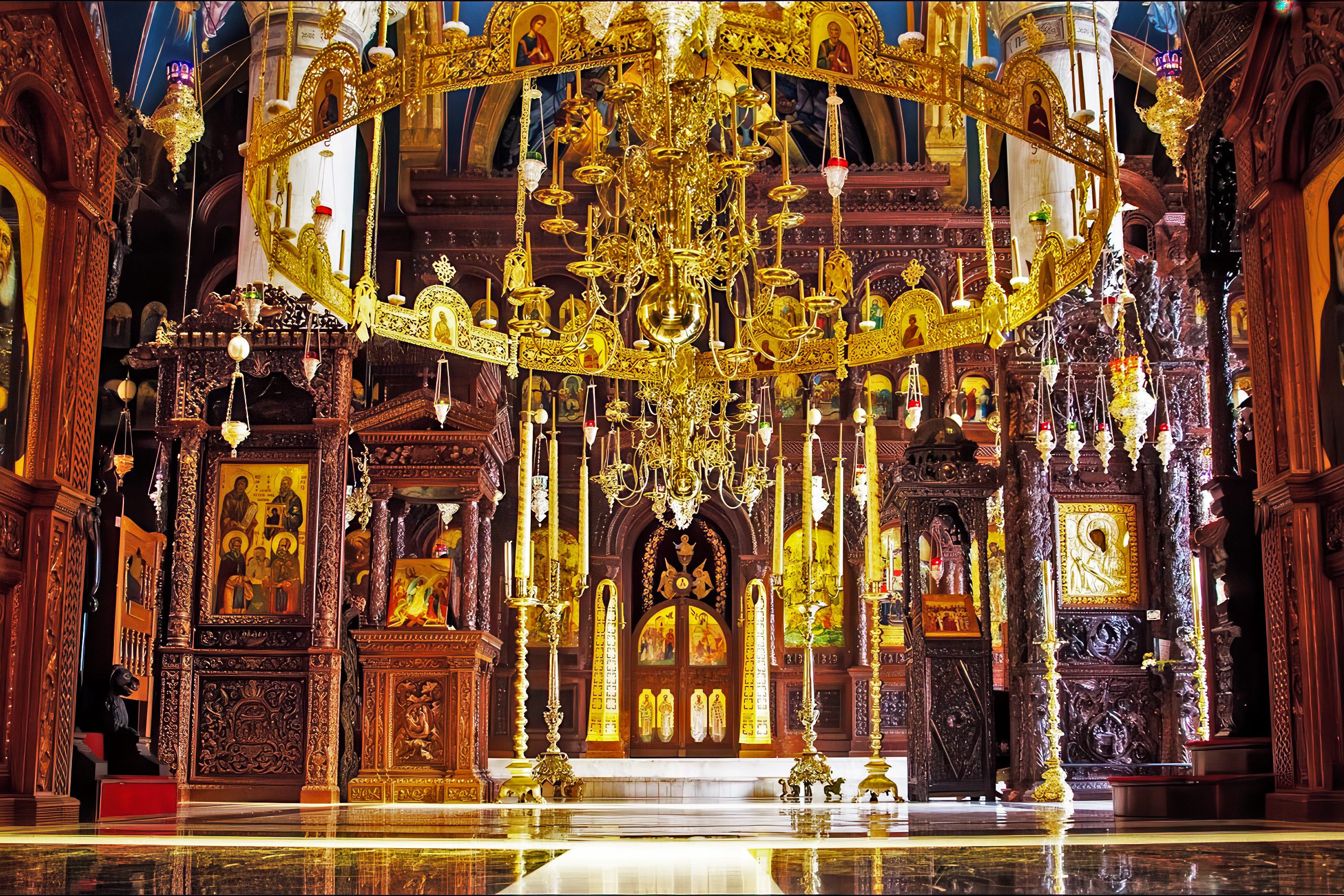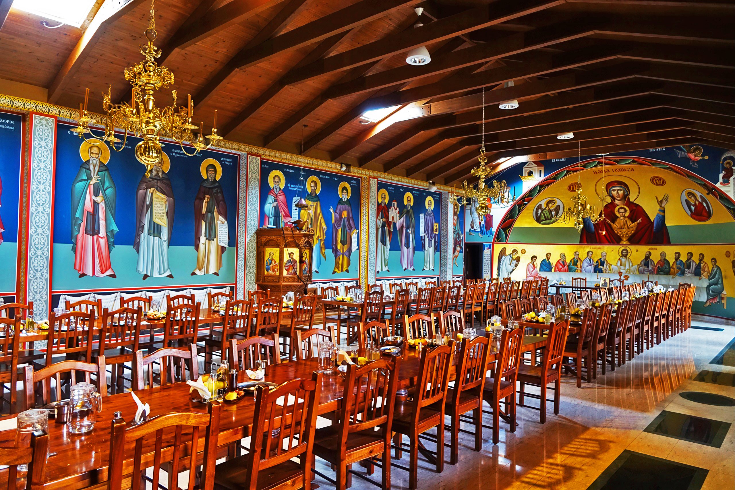 The interior of the church is decorated with religious icons, chandeliers, stone floors and wall frescoes. The icon of the Virgin Mary takes a prominent position. The renovated vestry basement houses the monks’ original cells, stables, and storage areas, along with collections of old books, manuscripts, icons, and religious artifacts. The monastery library contains thousands of volumes including Greek and Ottoman documents preserved in the archive.
