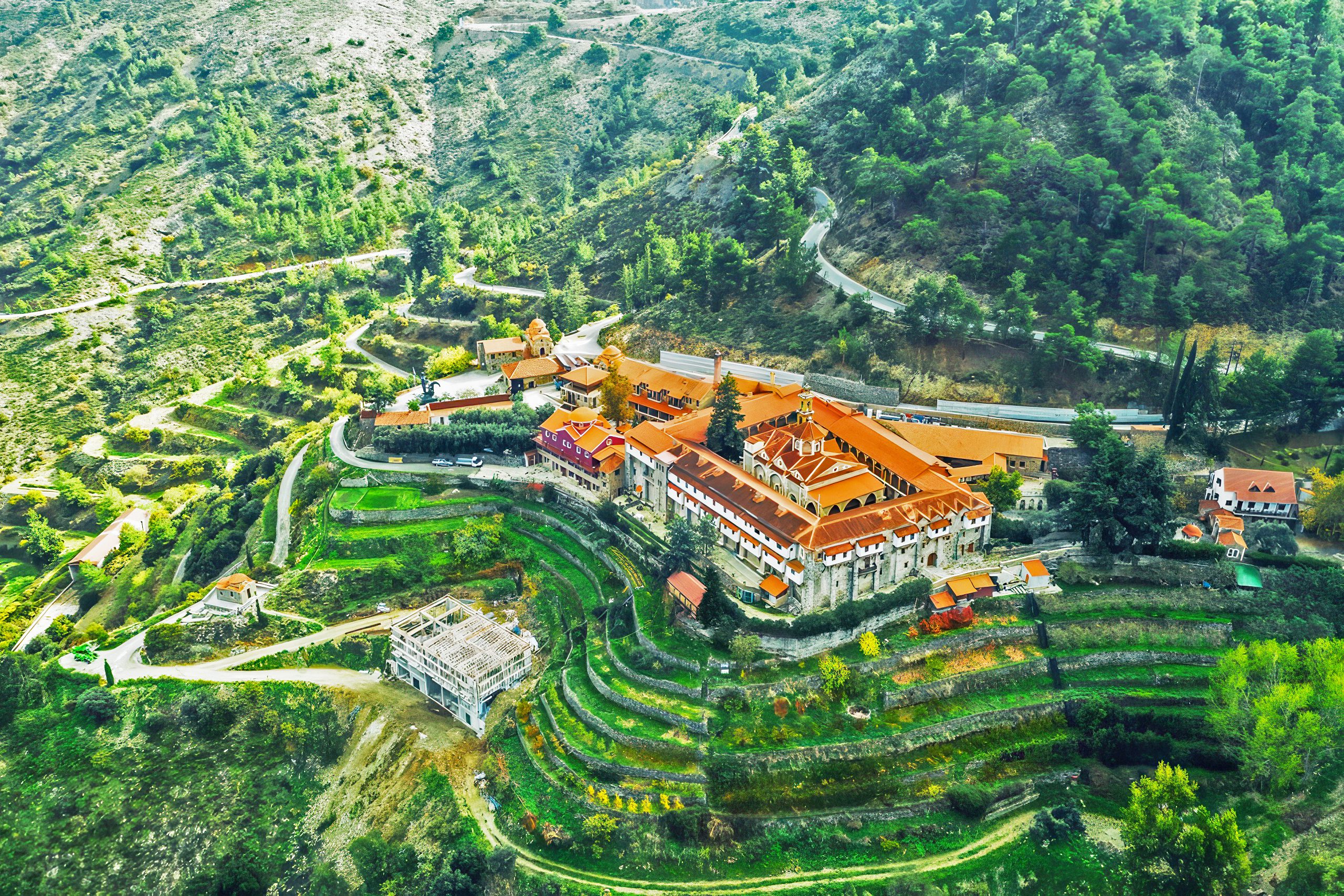 Holy Monastery of Panagia Machaira is a historic monastery dedicated to the Virgin Mary located about 40 km from the capital of Cyprus, Nicosia. The monastery is built near Mount Kionia, at an elevation of 870 meters, and surrounded by dense pine forests. The monastery towers like a fortress on a steep hillside above the Pediaios River, Cyprus’s longest waterway.