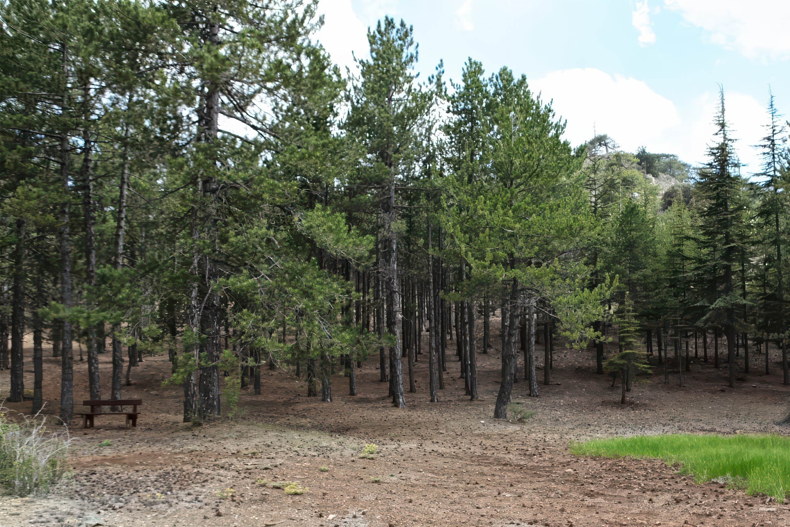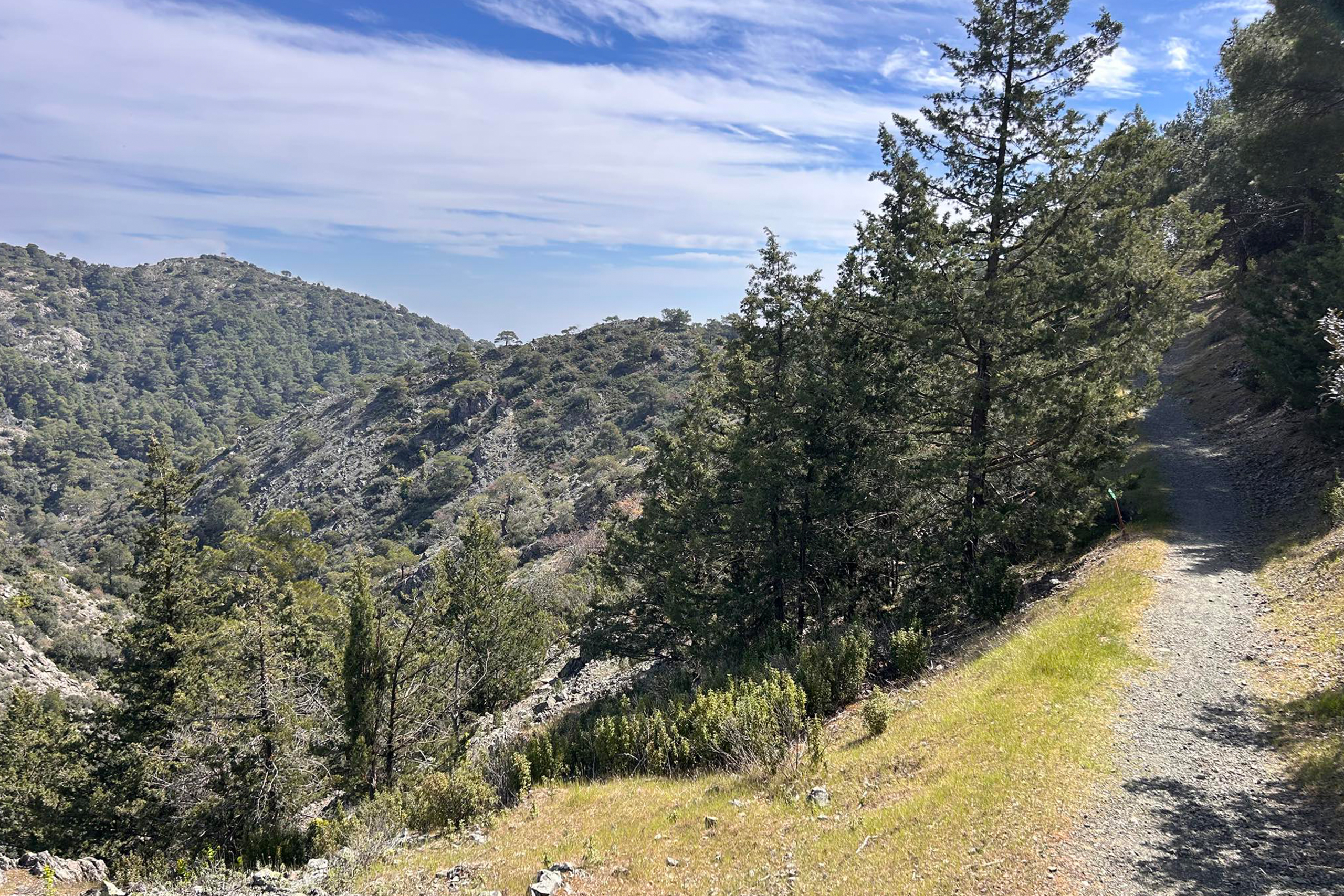 In the warmer, drier zones around Delikipos, Kyprovasa, Lythrodontas, Kapedes, and Filani, visitors find wild pine trees and Mediterranean vegetation including olive trees, hawthorn, terebinth, and cistus shrubs. The forest shows variation in density, with thick stands in some areas and sparse coverage in others. Some sections regenerate naturally without human intervention, while others are man-made plantations established after fires damaged areas like Drys, Moutti tou Kormou, and Tourkopoulieris.