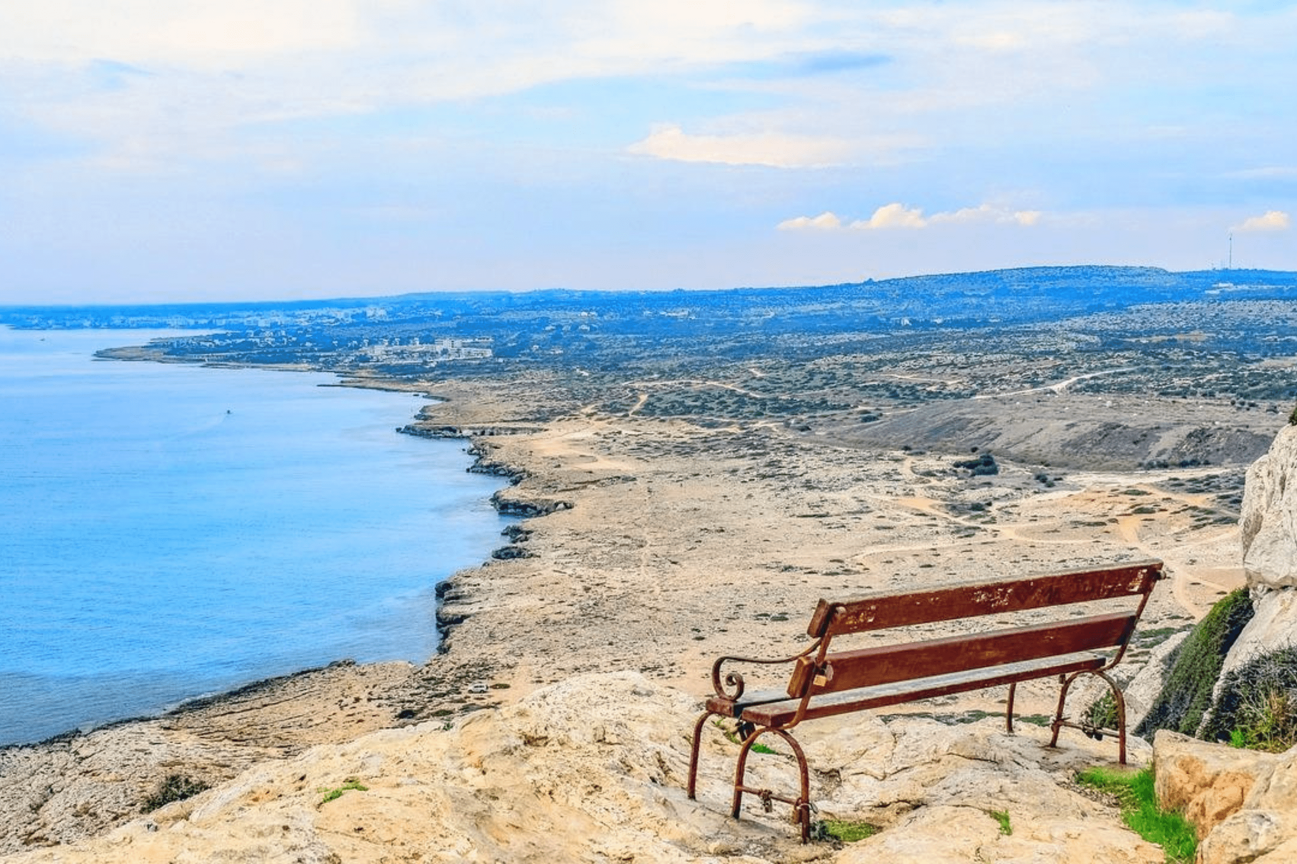 The wild beauty of the Akamas Peninsula offers some of the island’s most untouched elevated coastal views. One of the most rewarding stops is the Lara Bay viewpoint, where rugged cliffs overlook a vast stretch of golden sand meeting deep blue waters.
