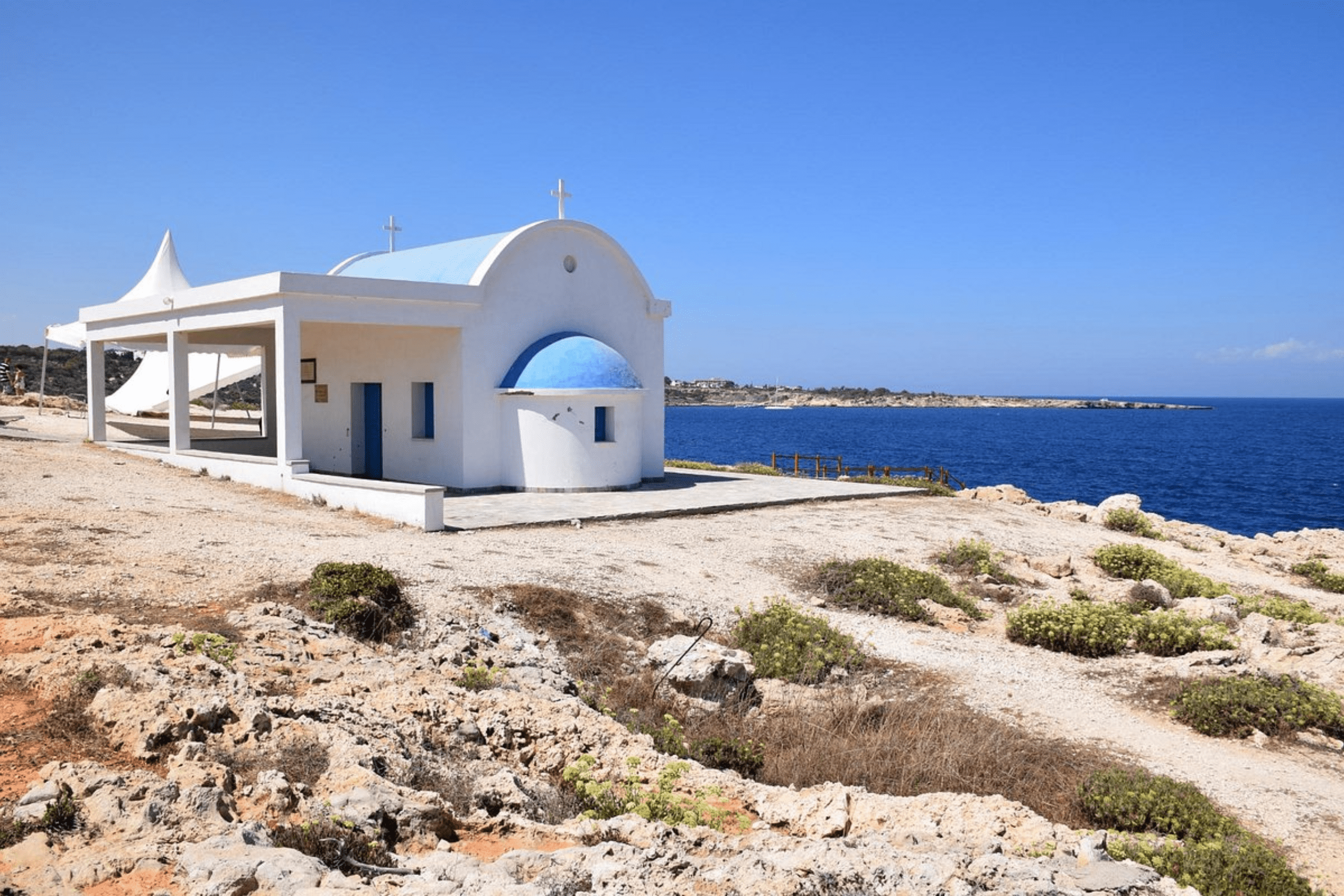 The Chapel of Agioi Anargyroi sits on rocky cliffs overlooking the sea and turquoise waters near Cape Greco. This tiny whitewashed church dedicated to Saints Cosmas and Damian features steps leading down to the sea where holy water runs. Below the chapel, a hermit’s cave mentioned in local legend adds historical intrigue. The chapel has become a popular spot for wedding photos due to its stunning clifftop location.