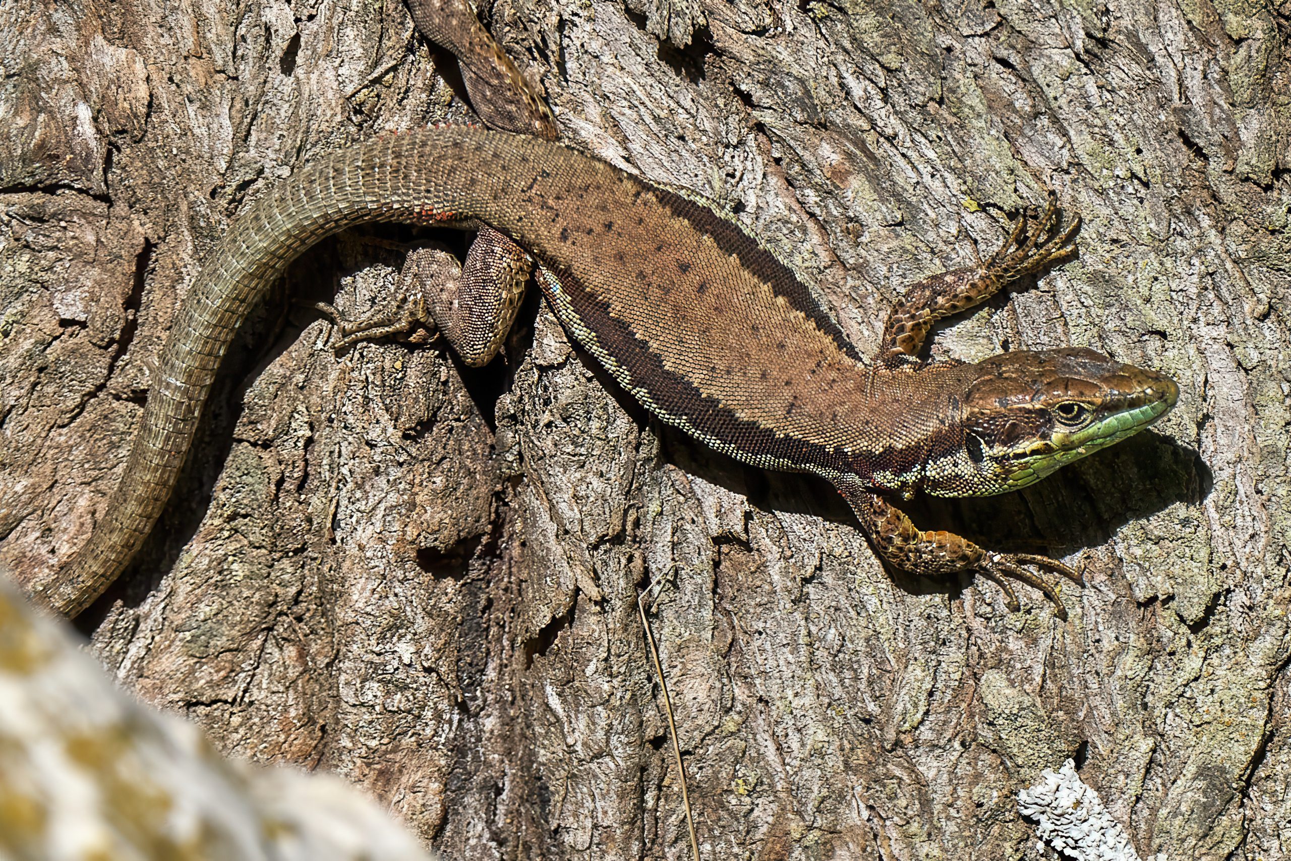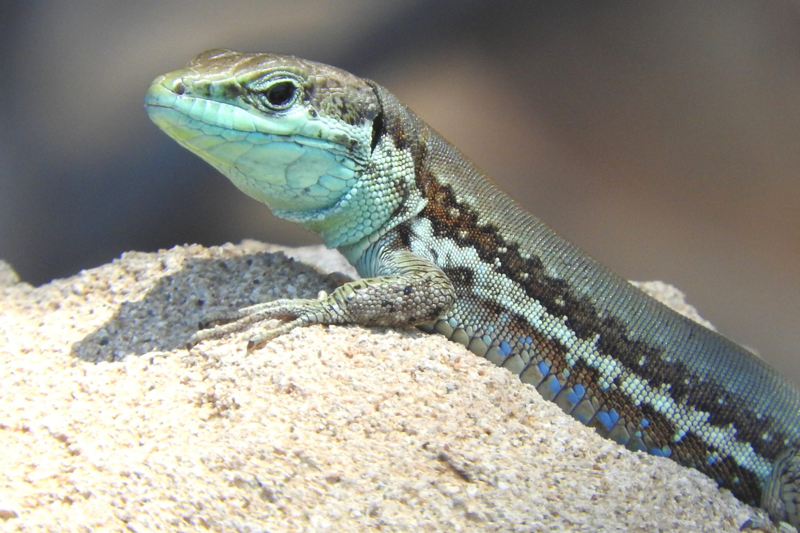 What sets the Troodos lizard apart is its sleek, streamlined form, measuring roughly 15 centimeters from nose to tail tip. Males boast vibrant green hues with black stripes along their sides, while females are more subdued in browns and grays, blending seamlessly with pine needles and stones. In the breeding season the males develop orange blotches on the sides of the head and their underside also changes to orange with blue and red spots along the flanks.Their long tails aid in balance during swift escapes, and sharp claws grip rocky surfaces like nature’s own Velcro. Behaviorally, they’re diurnal hunters, basking in morning sun before pursuing insects with lightning dashes. Unlike bolder relatives, this lizard is wary, vanishing into undergrowth at the slightest disturbance – a trait honed by predators like snakes and birds of prey.