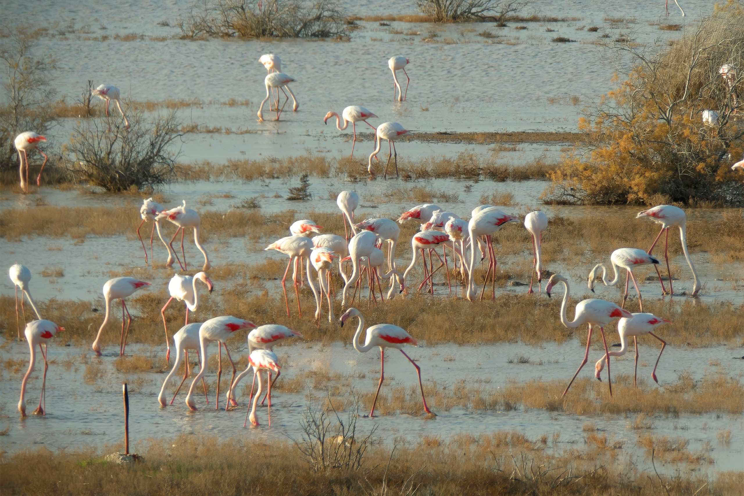 It is estimated that the number of Greater Flamingos may reach up to 20,000 individuals, depending on conditions. These pink birds arrive from breeding grounds in Turkey, Syria, northern Italy, Sardinia, and Iran, seeking milder winter conditions. The flamingos feed on algae, crustaceans, and mollusks found in the shallow saline waters.