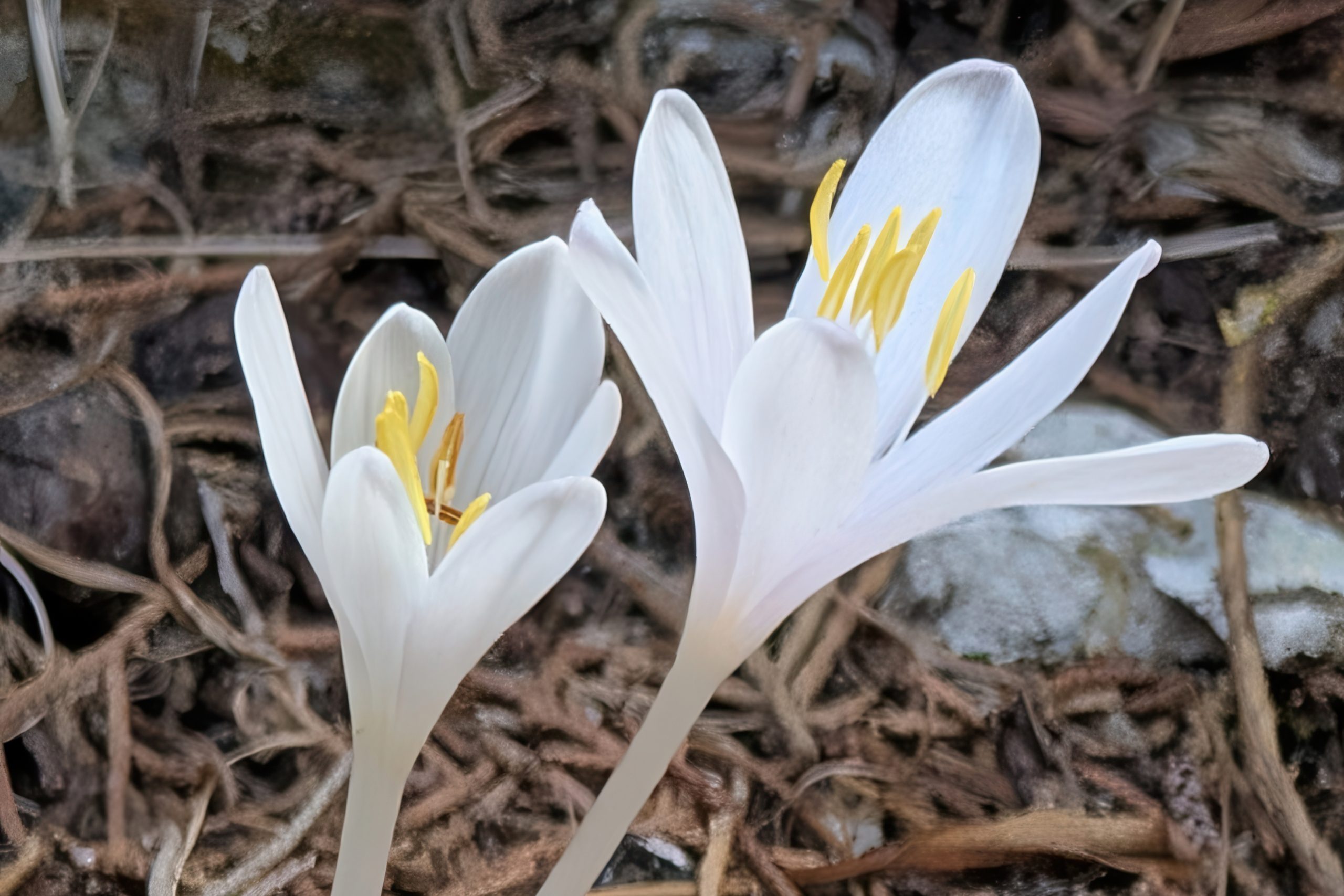 This plant sends up a bunch of cup-shaped flowers on short stems that are usually white or pale pink, measuring around 2.5-4.5 cm long. The blooms have six petals and bright yellow stamens in the center, appearing completely without leaves—which only show up later as long, strap-like greens up to 20 cm. Its underground corm is egg-shaped and covered in protective layers, helping it survive in rocky spots. It’s easy to mix up with true crocuses, but colchicums have three styles and six stamens, while crocuses have one style with three stigmas and three stamens