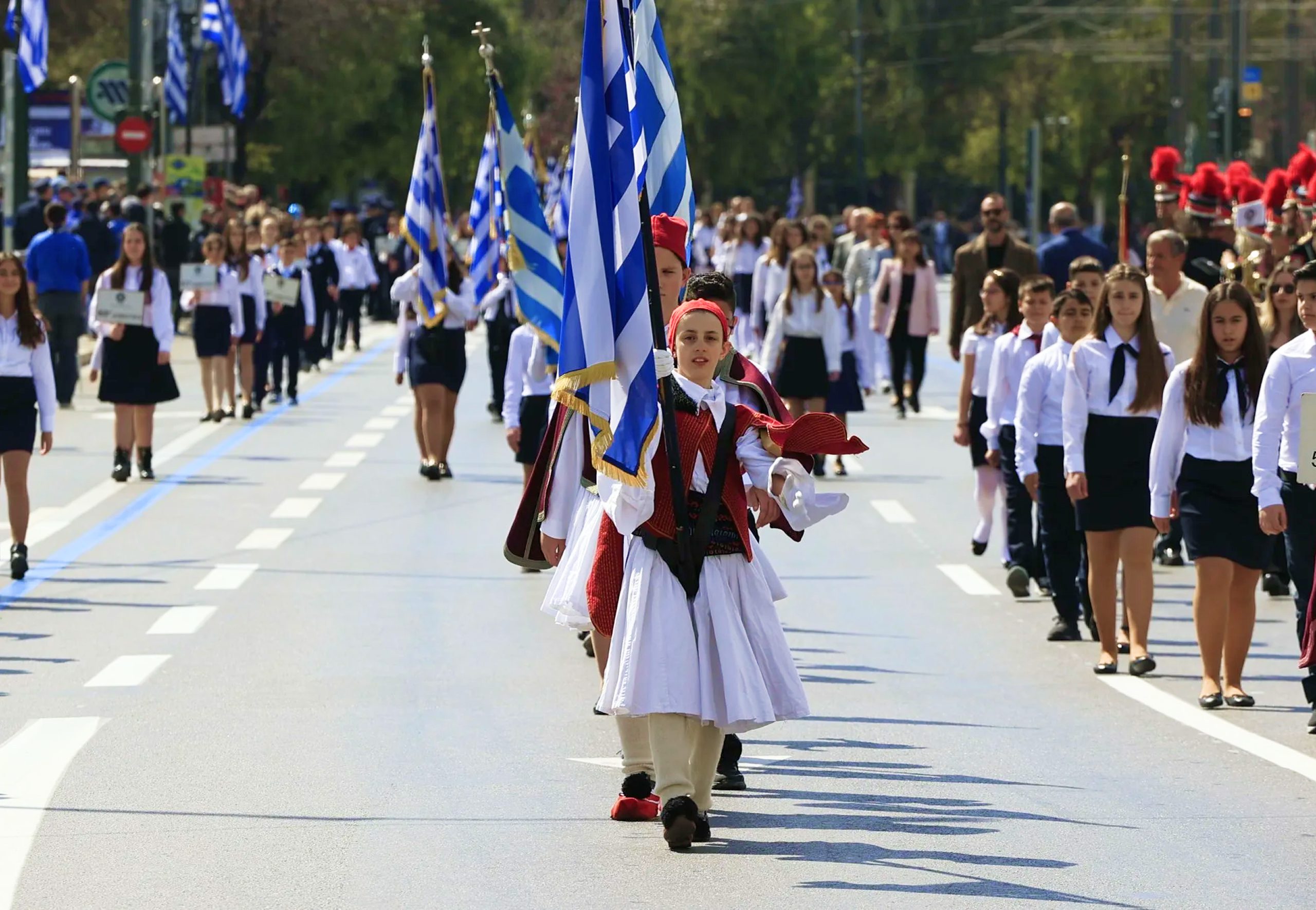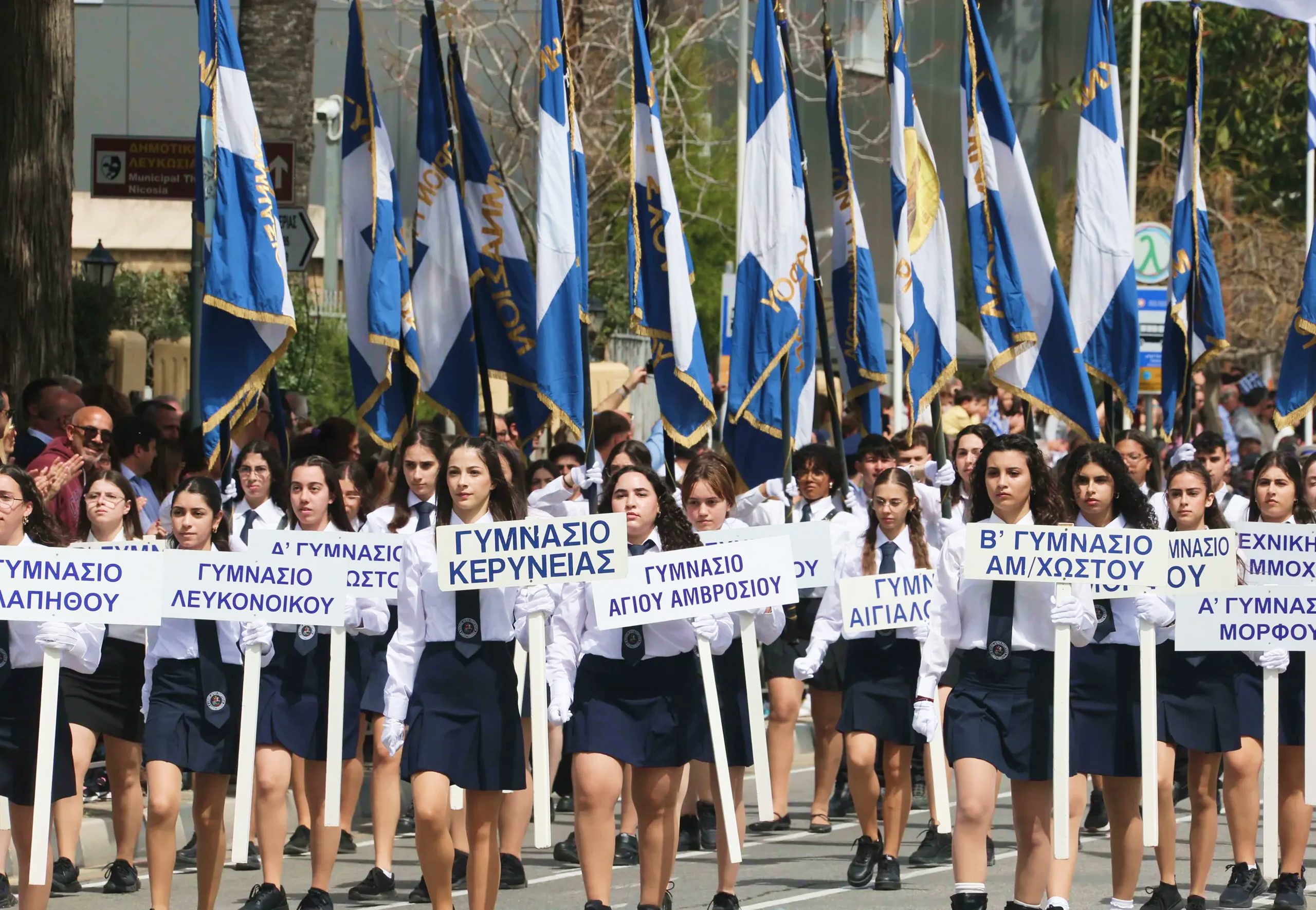 On March 25, major cities, including Nicosia, Limassol, Larnaca, and Paphos organize parades with participation from students, schoolchildren, National Guard units, and representatives of various organizations. Children march with Greek flags while many dress in traditional Greek costumes. Military parades consist of several divisions from the National Guard, Greek forces stationed in Cyprus, police, and fire services. Marching bands accompany the processions, playing the national anthem and patriotic songs.