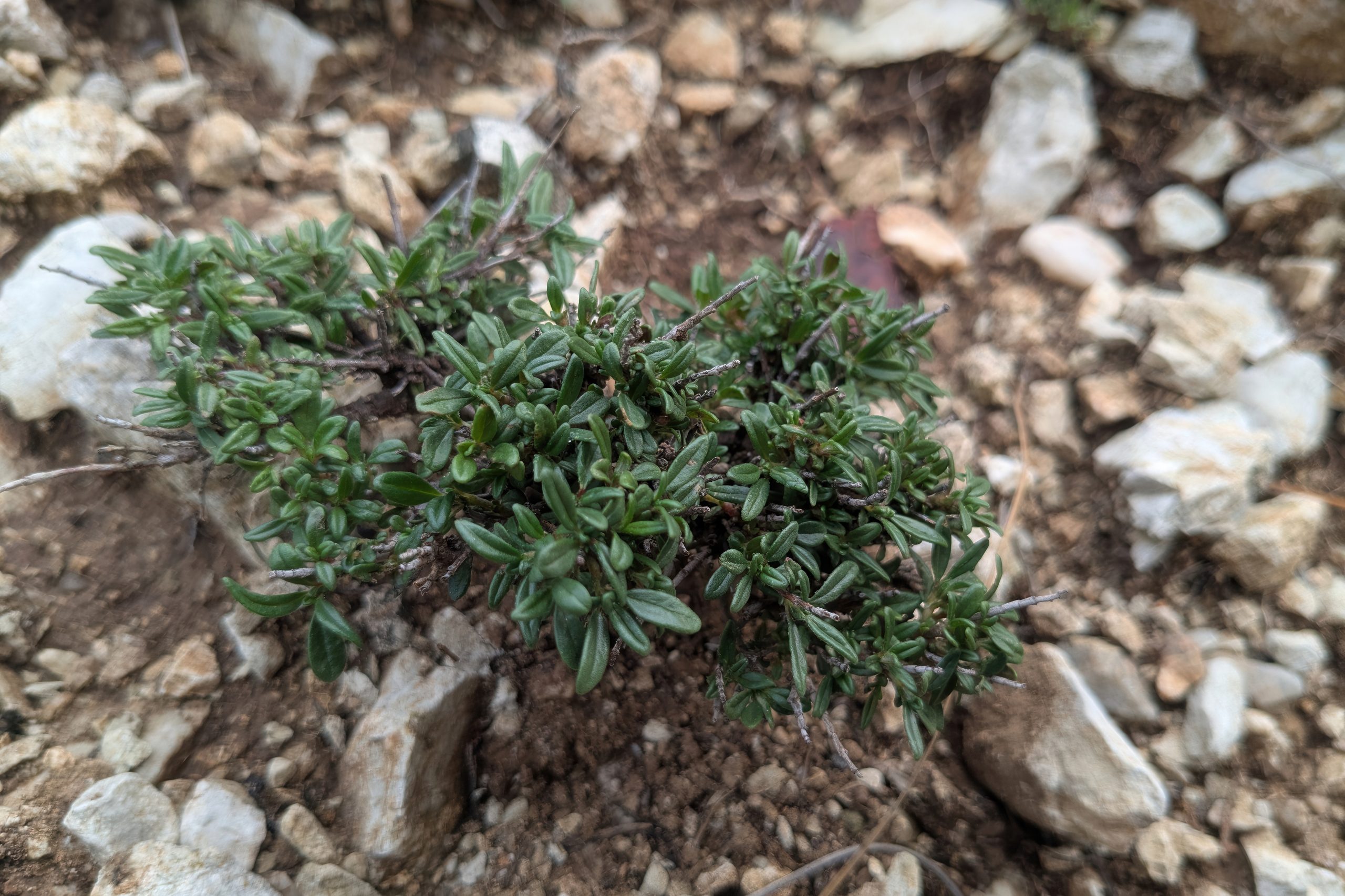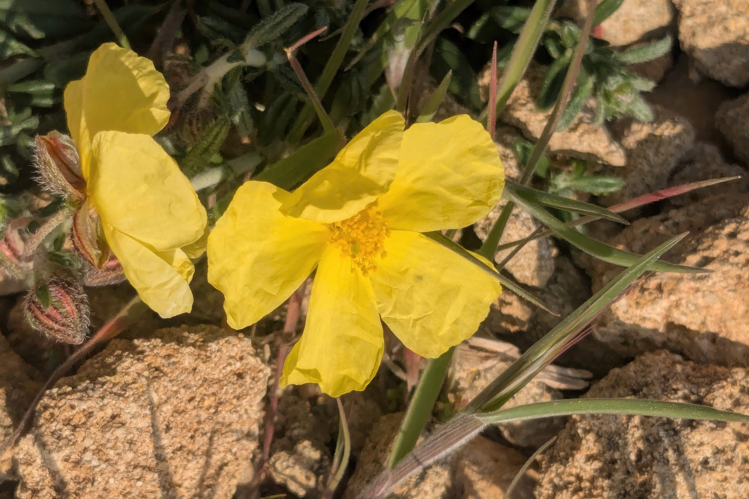 This low-growing plant reaches about 25-30 cm tall, with woody stems that spread out like a cozy mat on the ground. Its leaves are narrow and blunt-tipped, covered in soft hairs for a fuzzy feel, while the bright yellow flowers — about 1-2 cm wide with five crinkly petals cluster together, blooming like tiny suns against stony backdrops.
