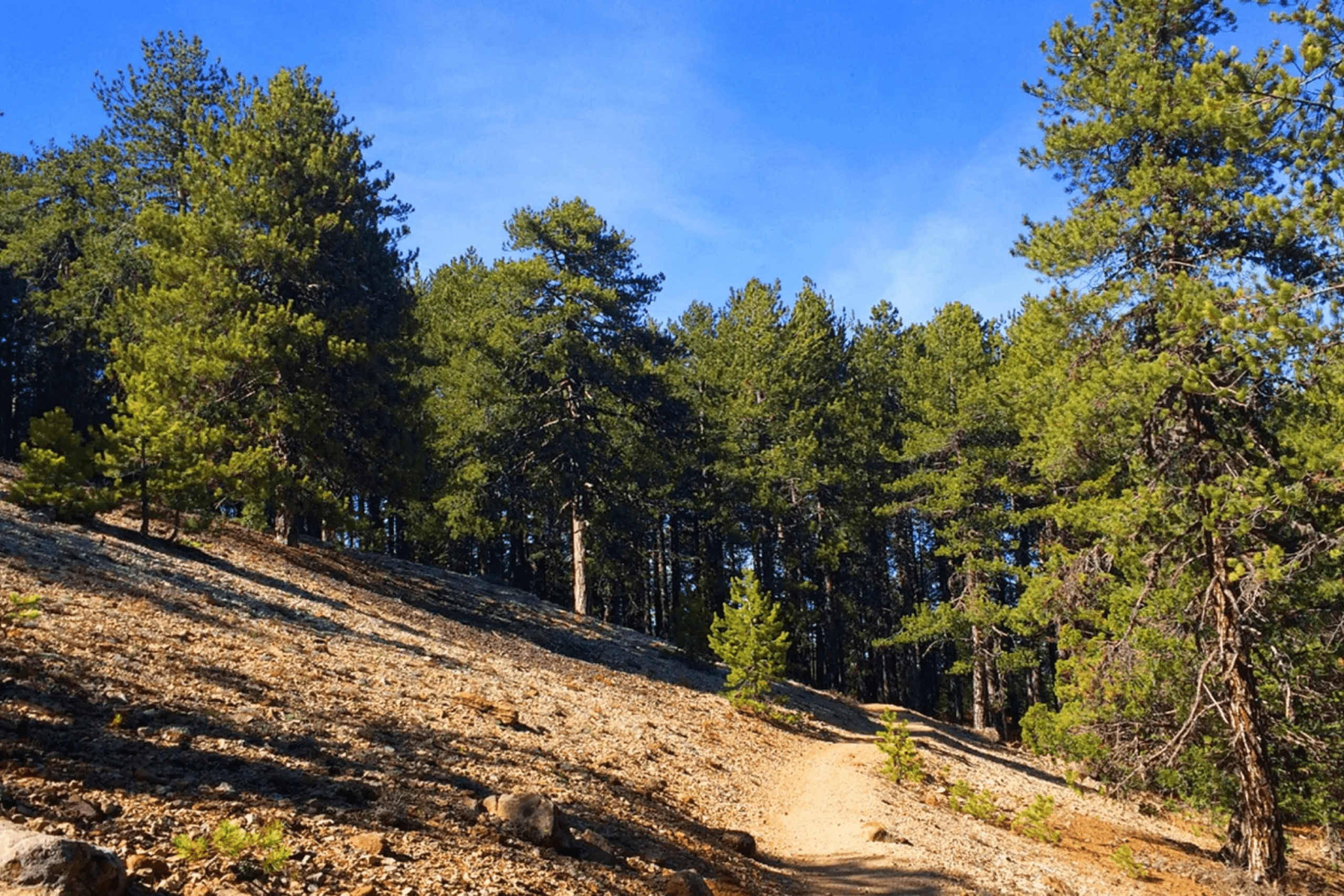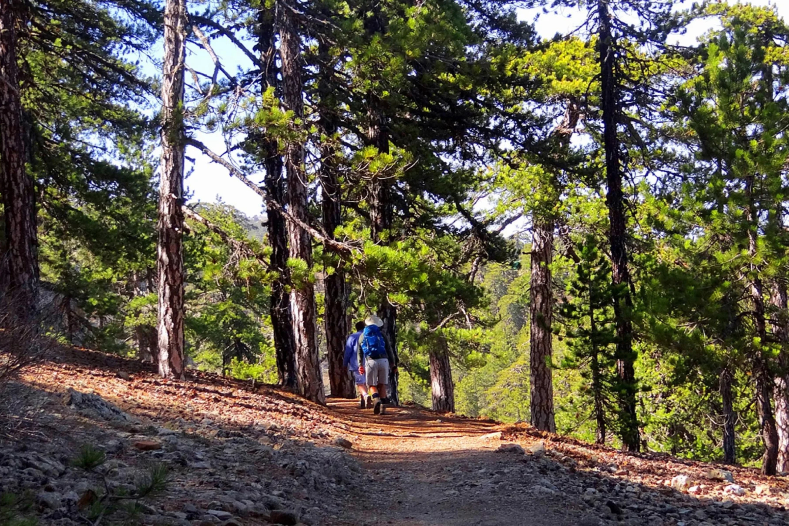 The Artemis Trail forms a 7-kilometer circular route around Mount Olympus at an elevation of 1,800 meters, making it the highest trail in Cyprus. The path passes through dense stands of black pine and Troodos juniper, offering panoramic views of the surrounding mountains. The terrain alternates between cliff-side paths, woodlands, and brushland. The trail begins and ends at the Cyprus Ski Club parking lot and takes approximately two to three hours to complete at a moderate pace.