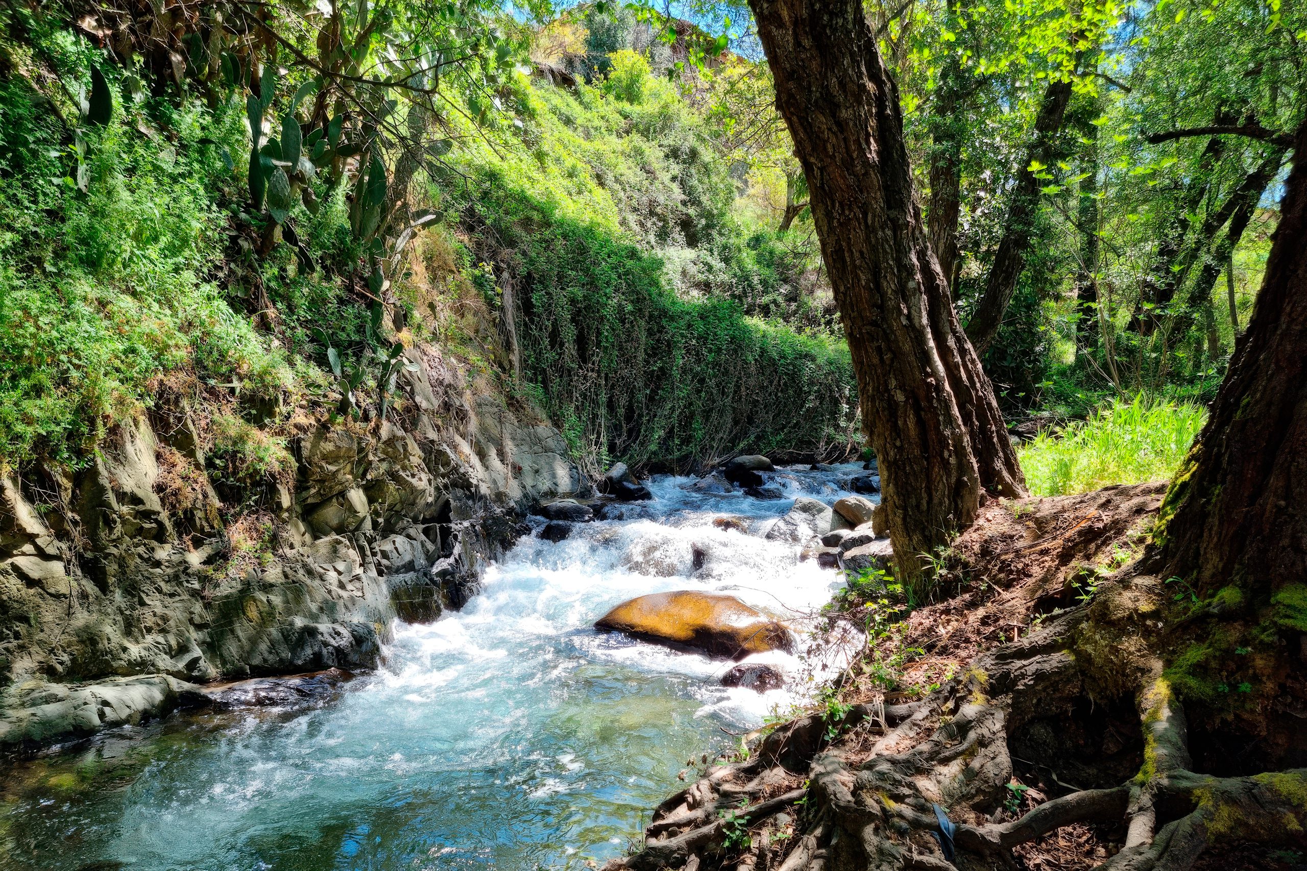 The gorge takes form along the banks of two rivers that maintain year-round flow, unusual for Cyprus where most streams run dry during summer. The Karkotis originates from the northwestern slopes of Papoutsa peak, while the Garillis flows from the northeastern slopes of Mount Troodos. Hundreds of springs feed both rivers as they descend through the mountains before joining at Kakopetria village. The continuous water flow created the Solea Valley, one of Cyprus’s most fertile mountain regions.