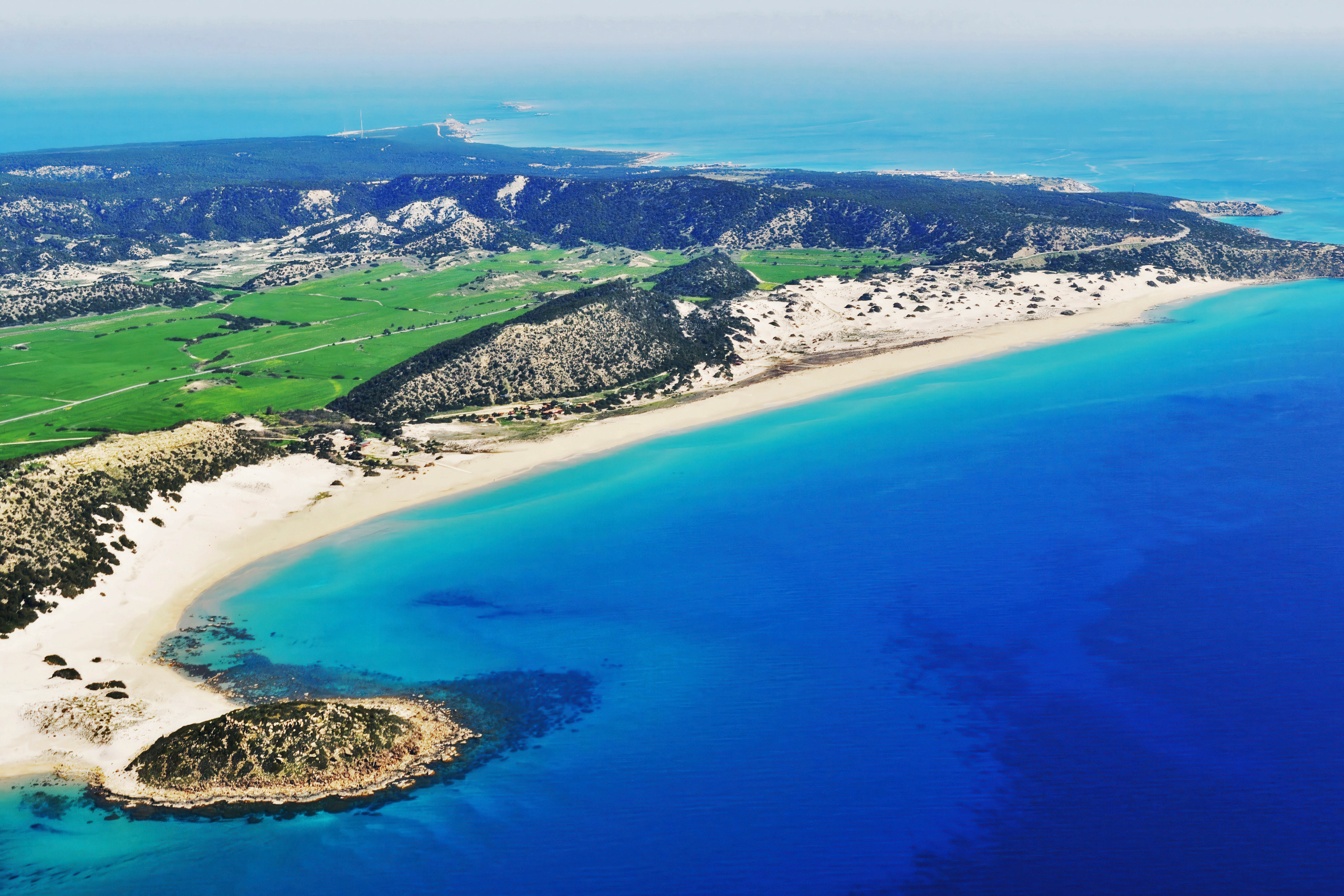 The Karpasia Peninsula, also known as the “panhandle” of Cyprus, extends 80 kilometers into the Mediterranean from the island’s northeast, encompassing a sub-humid climate that distinguishes it from the drier central Mesaoria Plains. Annual rainfall averages 450-550 millimeters, about 20-30% higher than inland areas, concentrated in winter months from November to March, with mild temperatures ranging from 15-20°C. Summers are warm, with highs of 30-35°C moderated by sea breezes, and lower evaporation rates due to coastal proximity. This slight increase in moisture supports lush maquis scrub dominated by evergreen shrubs like lentisk (Pistacia lentiscus) and wild olive (Olea europaea), wetlands that form ephemeral lagoons, and seasonal agriculture focused on rain-fed crops like wheat and barley. The climate’s balance creates isolated niches, where freshwater sources and salt marshes coexist, making Karpasia a biodiversity hotspot with over 600 plant species and a key area for migratory wildlife on an otherwise arid island.
