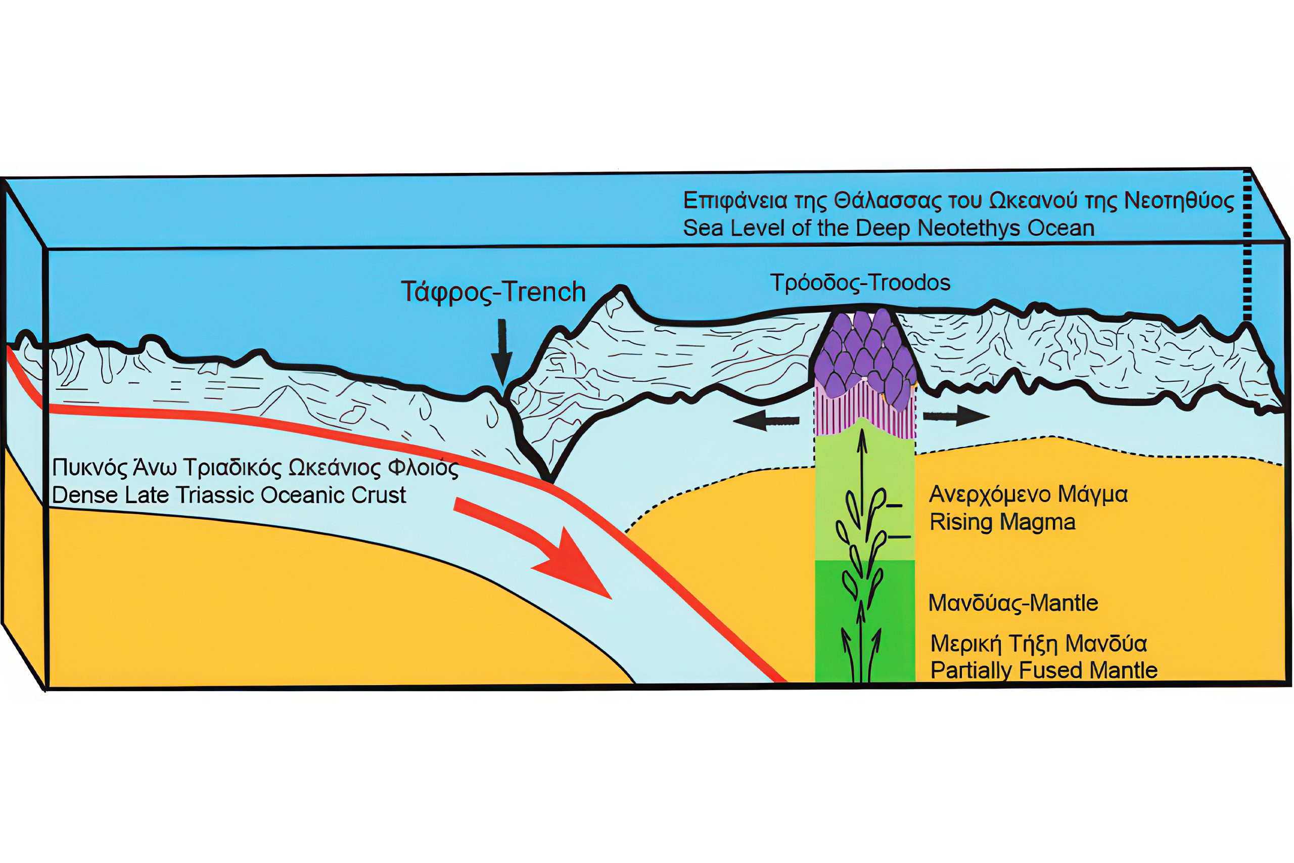 About 90 million years ago, during the Late Cretaceous period, Cyprus didn’t exist as an island. Instead, the rocks that now form the Troodos Mountains were part of the Neotethys Ocean seafloor. At underwater spreading ridges, hot magma rose from deep in the Earth and created new ocean crust. This process happened in a region above a subduction zone where one tectonic plate was diving beneath another.